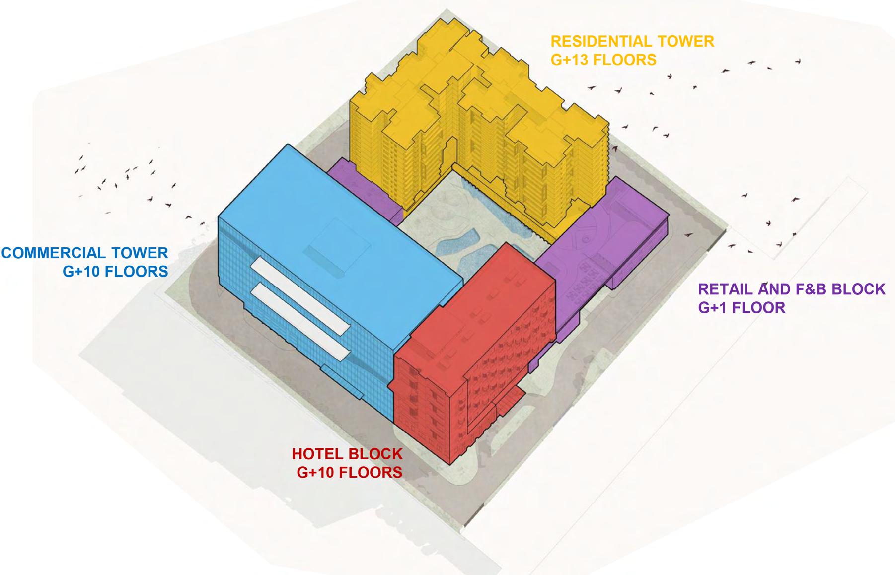 Monarch Celestial is a mixed-use design proposal integrating retail, residential, commercial office space, and a hotel. Careful zoning was implemented to ensure privacy and security across the different typologies. A central courtyard was introduced as both a visual focal point and a spatial buffer, enhancing privacy between buildings. Retail spaces were concentrated on the ground level for improved pedestrian access and connectivity with the courtyard. The landscaped courtyard features native plant species and water bodies, contributing to the project’s sustainability goals.