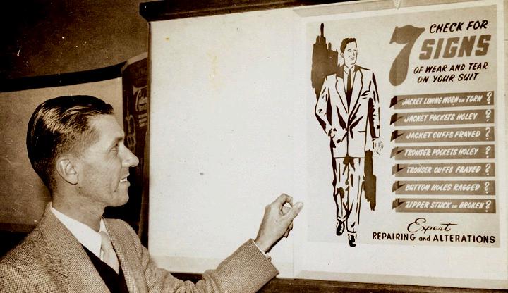 In an era of buying new clothes rather than repair, this dated photograph for the alteration industry speaks of a holey jacket or trouser pocket as indication of need for repair.