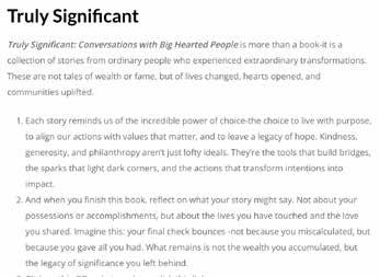 In addition, we celebrated the launch of our 12th book, Truly Significant – Conversations with Big Hearted People. We invite you to visit www.trulysignificant.com, where you’ll find podcasts and stories that celebrate people who are always lifting others up. We hope these conversations encourage and inspire you as much as they have inspired us.