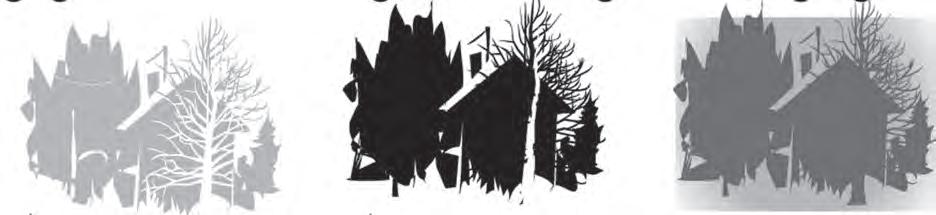 Long shapes such as telephone poles or trees often transition from light to dark. Te values change so gradually you don’t see the transitions. Shapes shif positive to negative, or vice versa, and that shif from one value to another is called a gradient, or a gradation, as seen at right.