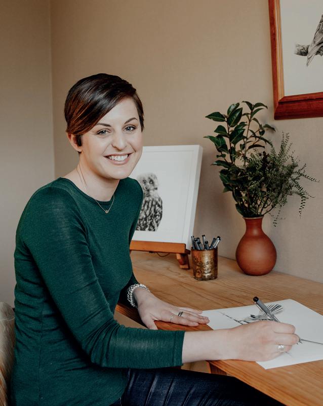 Her fine-tip pen drawings highlight the beauty of our native birds. They come in a range of sizes from A4 to A1 and can take up to 16 weeks to produce. She draws primarily from reference photos from her travels throughout NZ, including the following artworks from her time on Tiritiri Matangi: Bathing Bellbird, Kōkako Companions, and Tīeke Aroha.