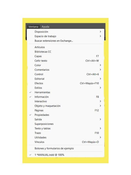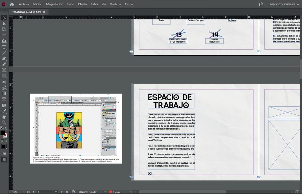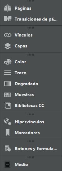 Panel Herramientas: incluye utilidades para crear y editar ilustraciones, elementos de página, etc.