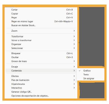 Al darle “clic derecho” a una forma o elementose puede elegir el contenido que deseas, se puede convertir en un gráfico, texto o sin asignar.