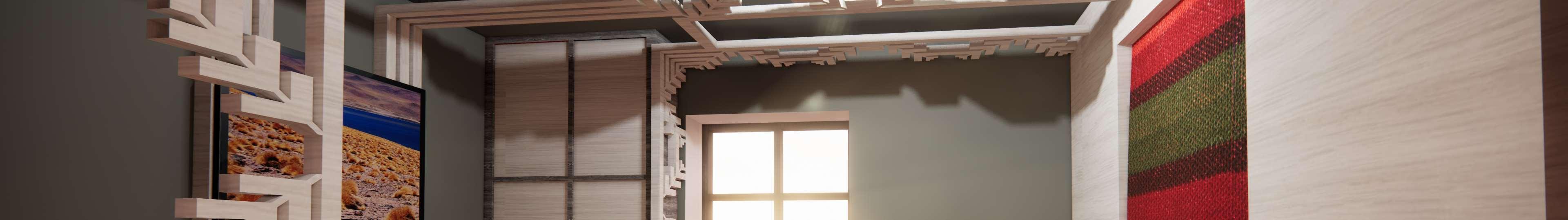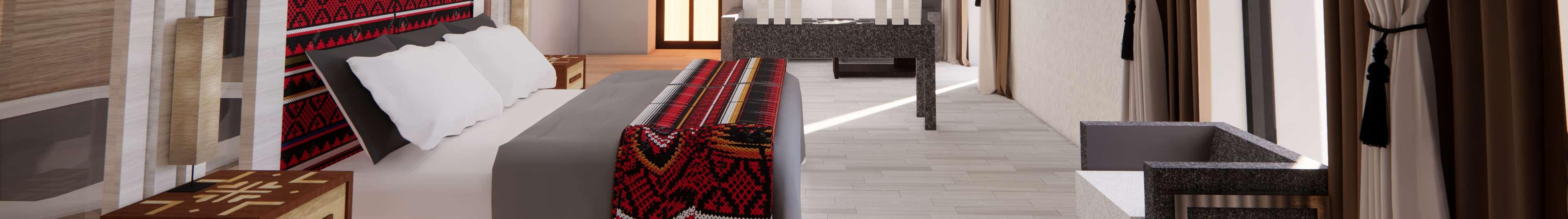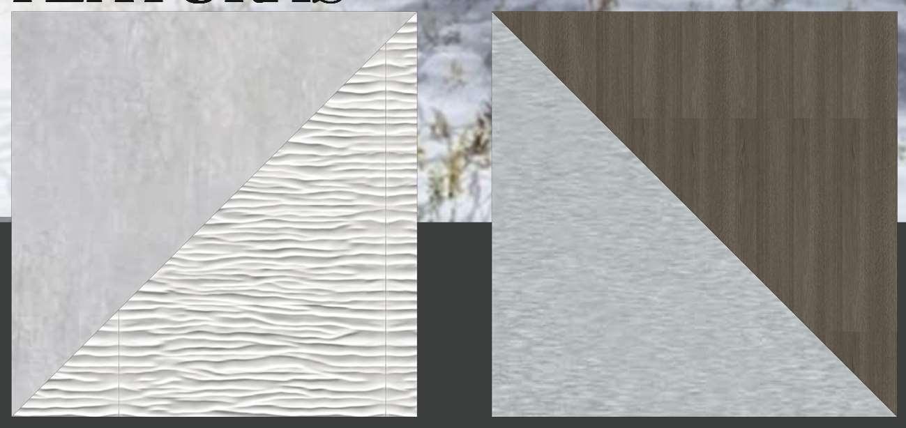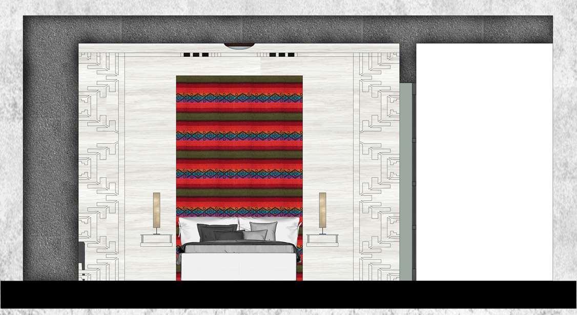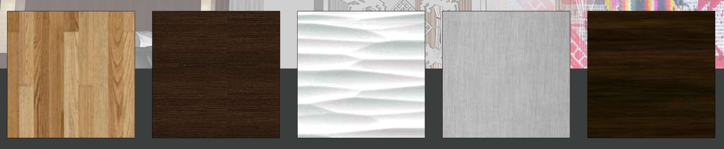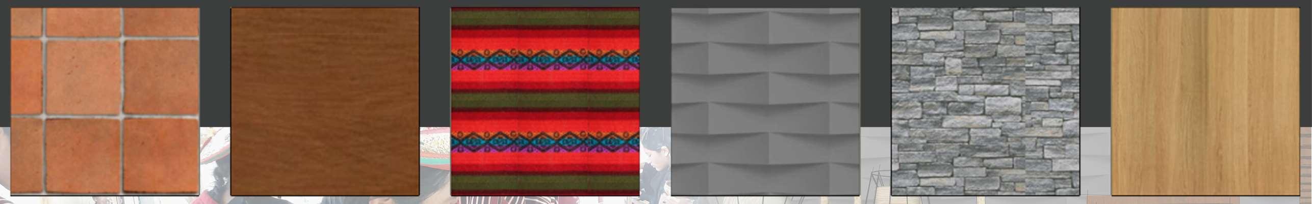 Elmaterialprincipalausareslamadera,se utilizaránplacasdeyesotexturizadoenlos murosyenelpisoporcelanatocontextura demadera.,eltejidotípicodelaculturase utilizaratambiénparatapizarelmobiliario.