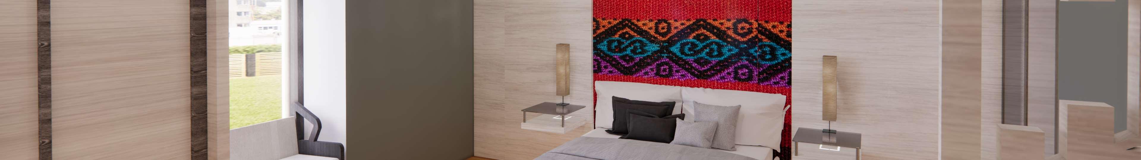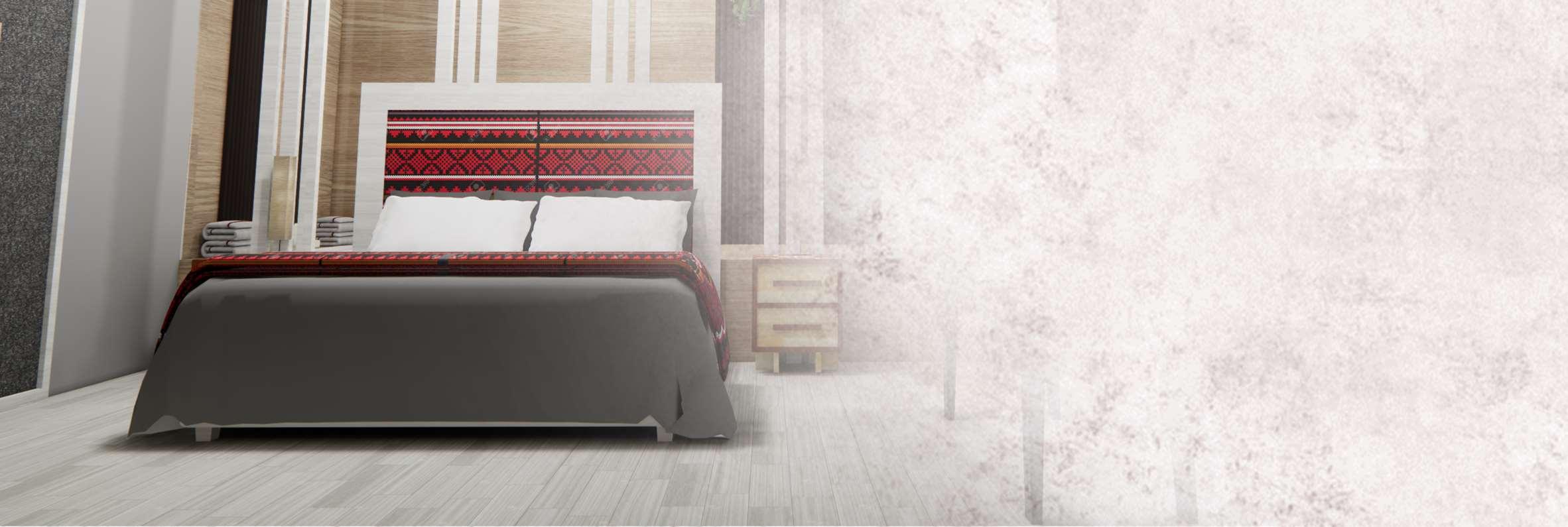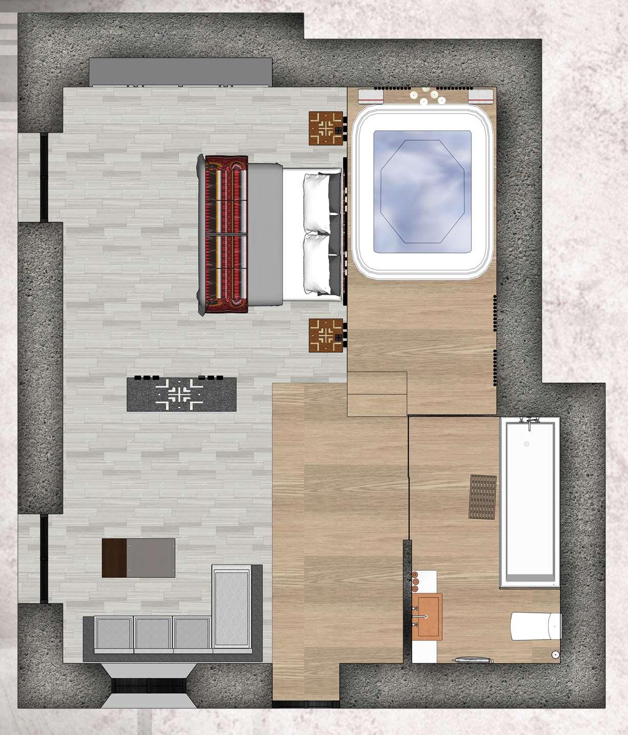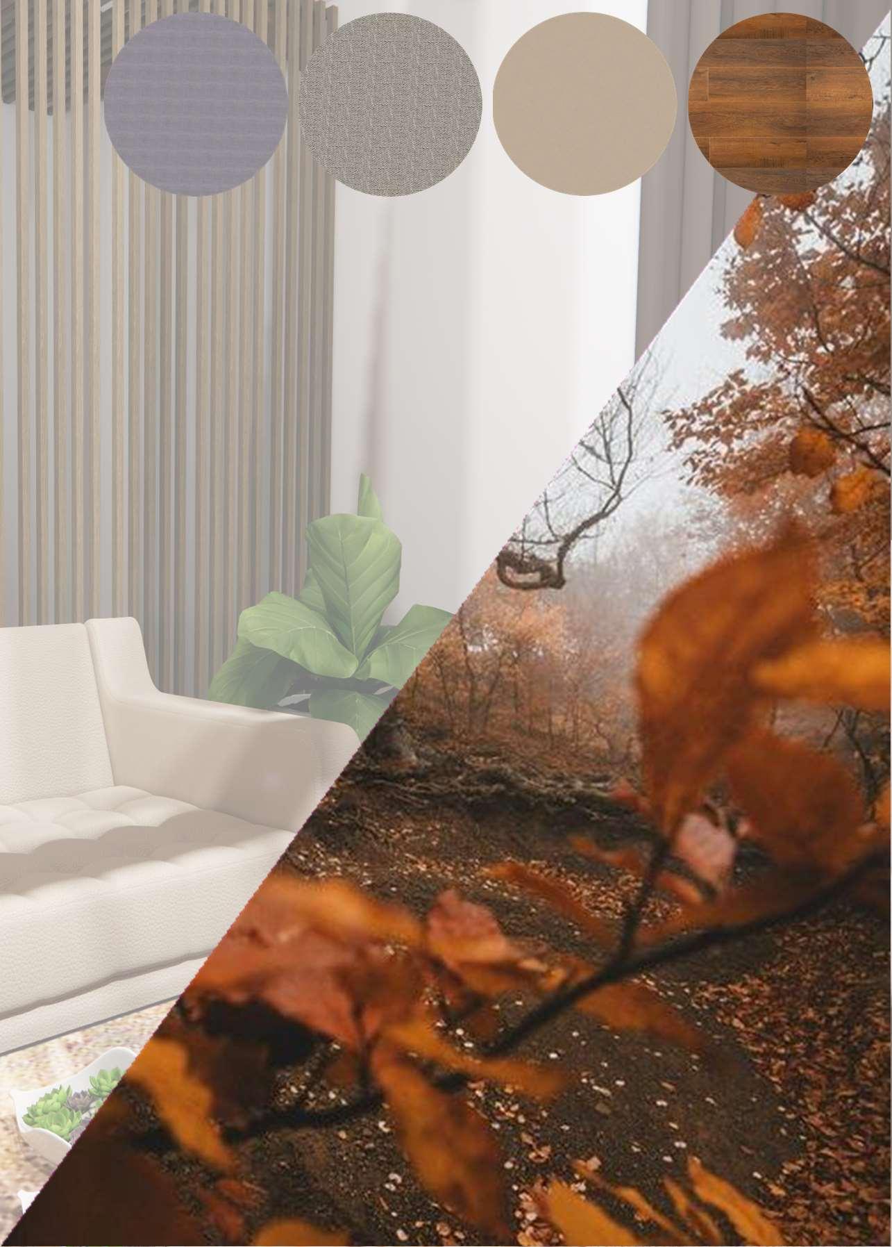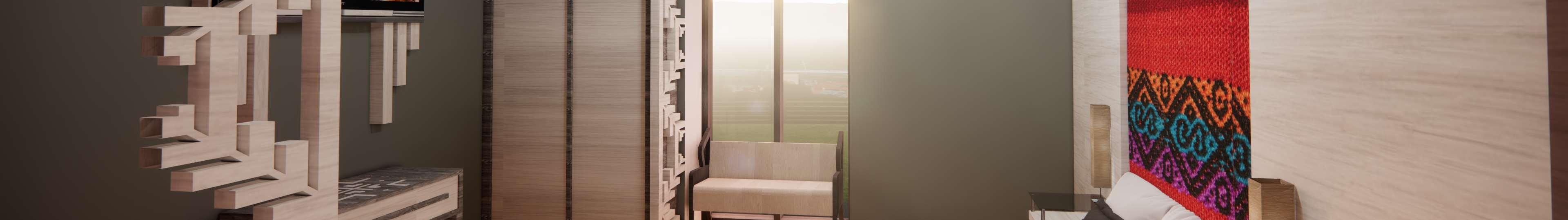 Elmaterialprincipalausareslamadera,se utilizaránplacasdeyesotexturizadoenlos murosyenelpisoporcelanatocontextura demadera.,eltejidotípicodelaculturase utilizaratambiénparatapizarelmobiliario.