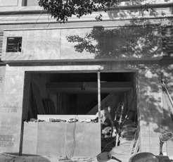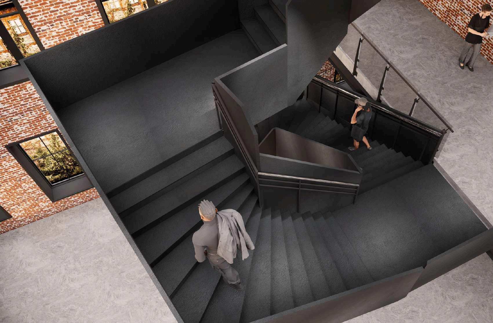 Thegeometrcstarcaserisessowlyaongthepato whlethesecondarystaircase iluminatedbythesunightfromthebackofthearch,runsstraghtahead Thetwostaircases presenttwodfferentspeeds onefoldsbackandforth withbrokensunightspilingoverthestaircase theotherswingsbackupaongtheedgeofthespace bathed nabundant sunlght.