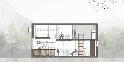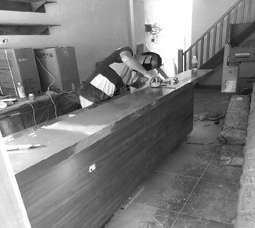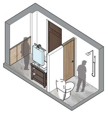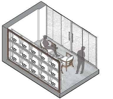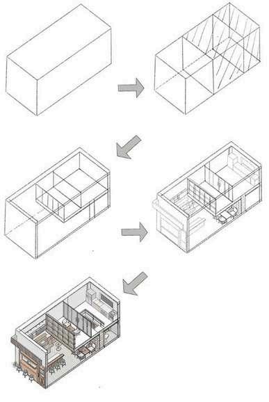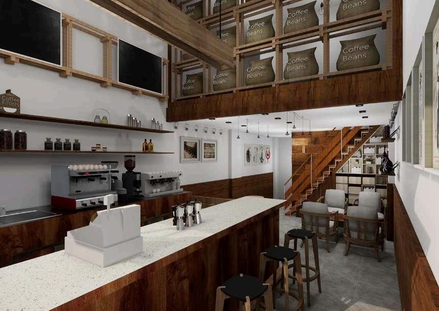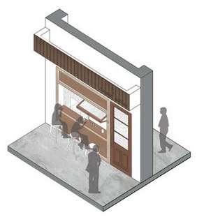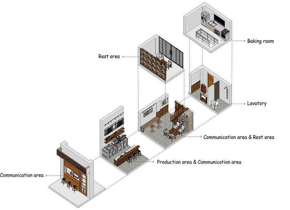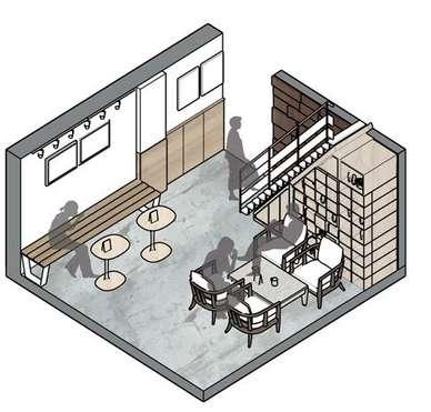 The f oor plan o the bar s des gned according to the production process and requ red dev ces of two baristas.It is an alln-one co fee tab e that can be cycled.