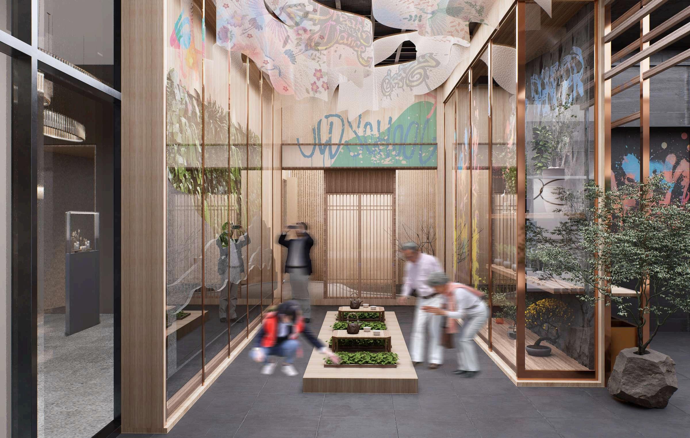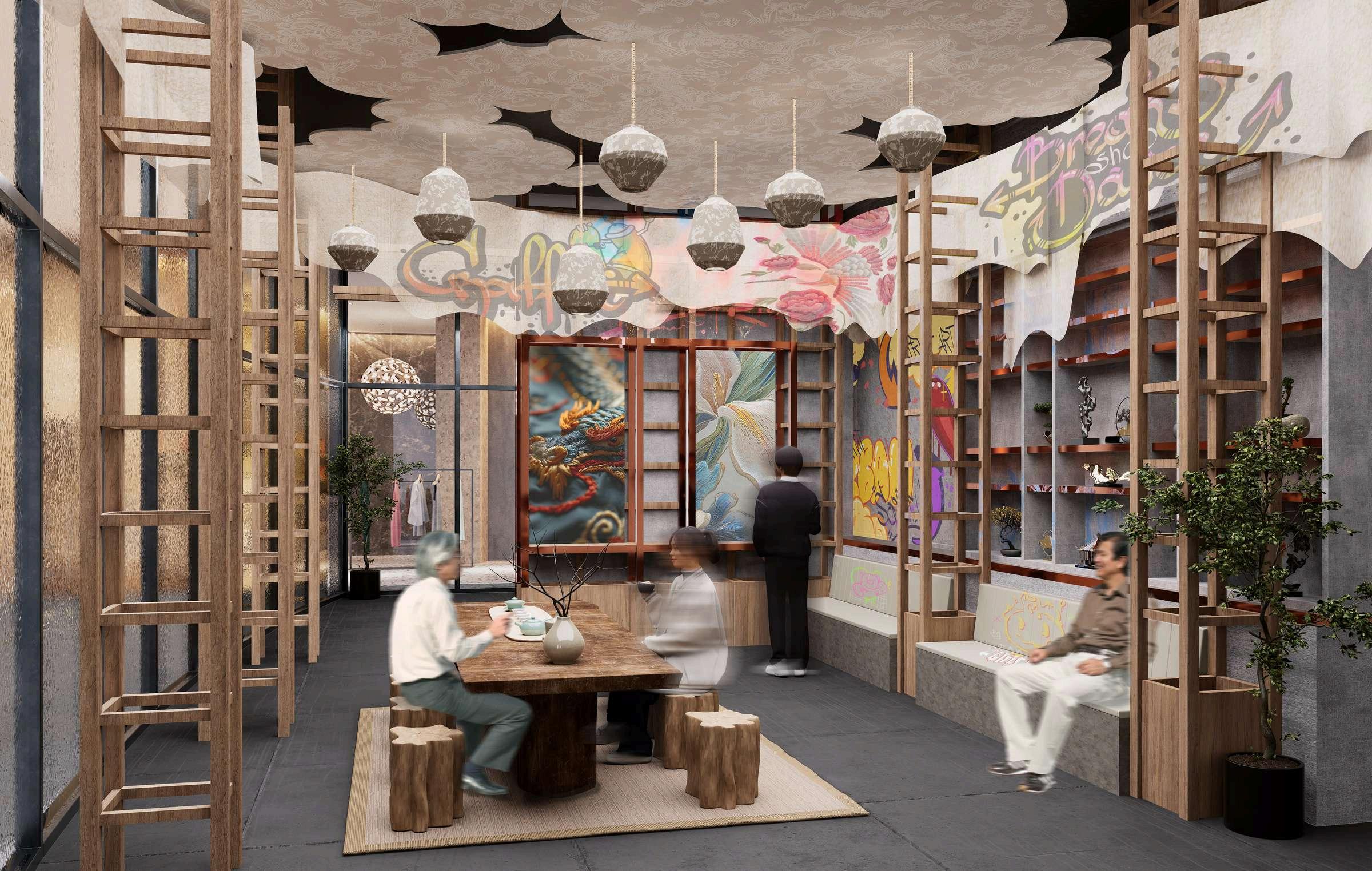 TeaScapemeldsancentteatraditionswithmodernartstryintoa sensoryjourney engagngsght,smel,taste touch,andhearing throughzonesadornedwthHunanembroideryandcontemporary grafft.Thisimmersiveconceptoffersmorethantea; texplores teasculturalandartsticessence creatingaunque,holstic experenceforthesenses.Perfectforthoseseekngtodeepentheir appreciatonofteaandconnectwiththeircommunity naspace wheretraditionalcreativtymeetsboundary-pushngcreatvity