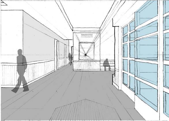 For this project I also created four perspective drawings to illustrate the feeling and mood of an individual walking from outside, through the front main entry into the lobby on the first floor. I also created a scaled plan, elevation and section drawing to provide detailed information for the viewer.