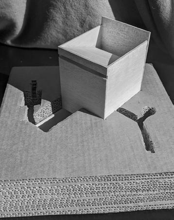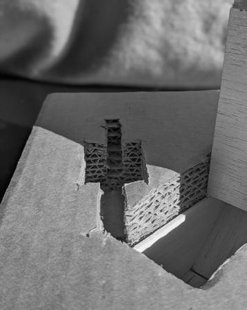 The model was constructed of cardboard and wood. The cardboard acts as the natural ground that I cut out of to create the subtractive spaces. The wood allowed me to explore the meaning of additive spaces and how they can mix with the ground and other subtractive spaces as well as showing stunning light throughout.