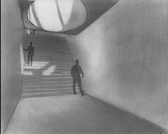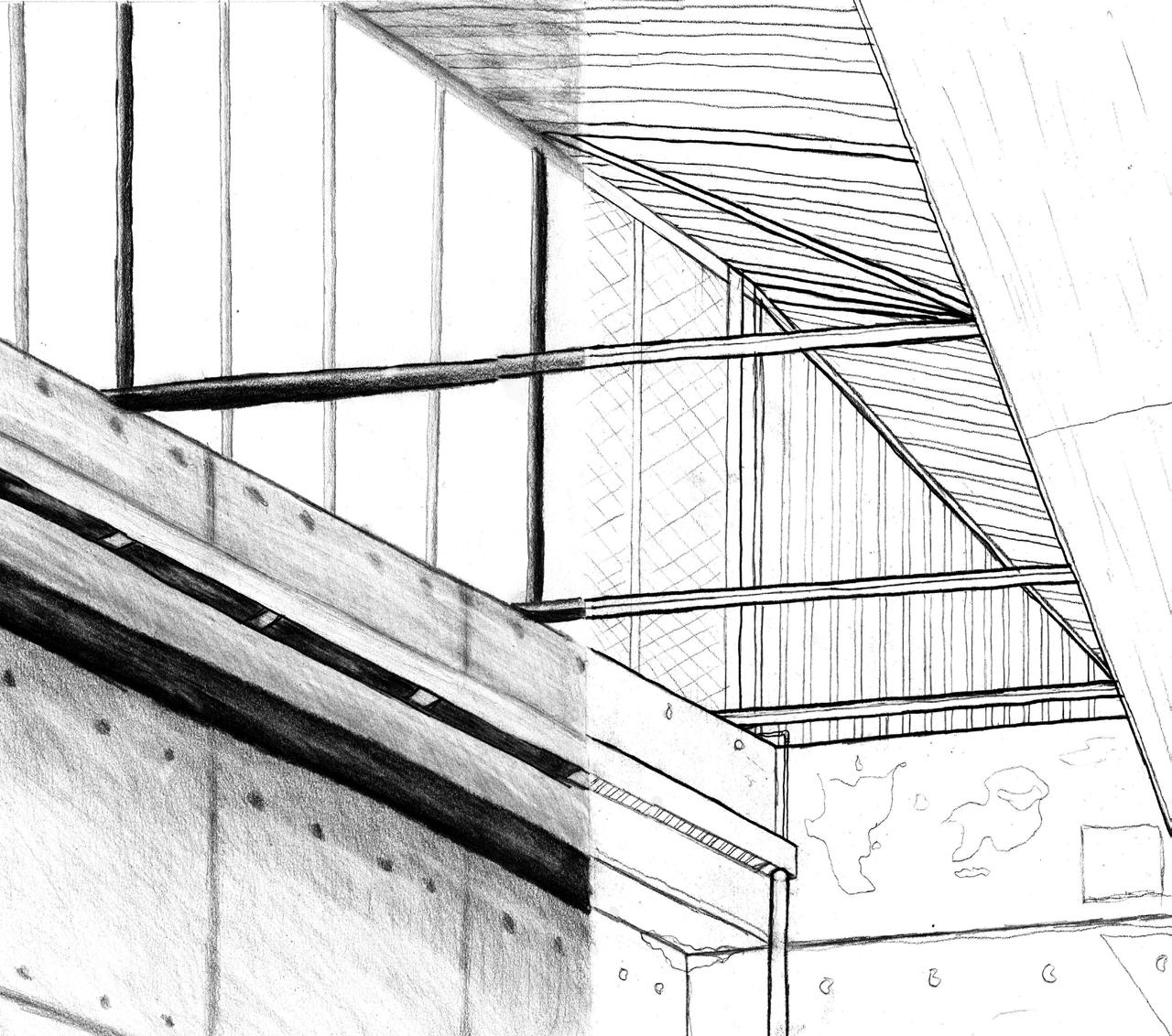 A Spatial Corner project required hand drawn images of a single corner in Gould Hall that included three major x, y, z planes. This corner had to include at least three distinct building materials such as concrete, steel and glass. The drawing aim to show half line and half tone illustrations that represent a full range of lighted surfaces. Each drawing for this assignment was done from direct observation and with freehand lines, while only using a straight edge to lay down the guidelines.