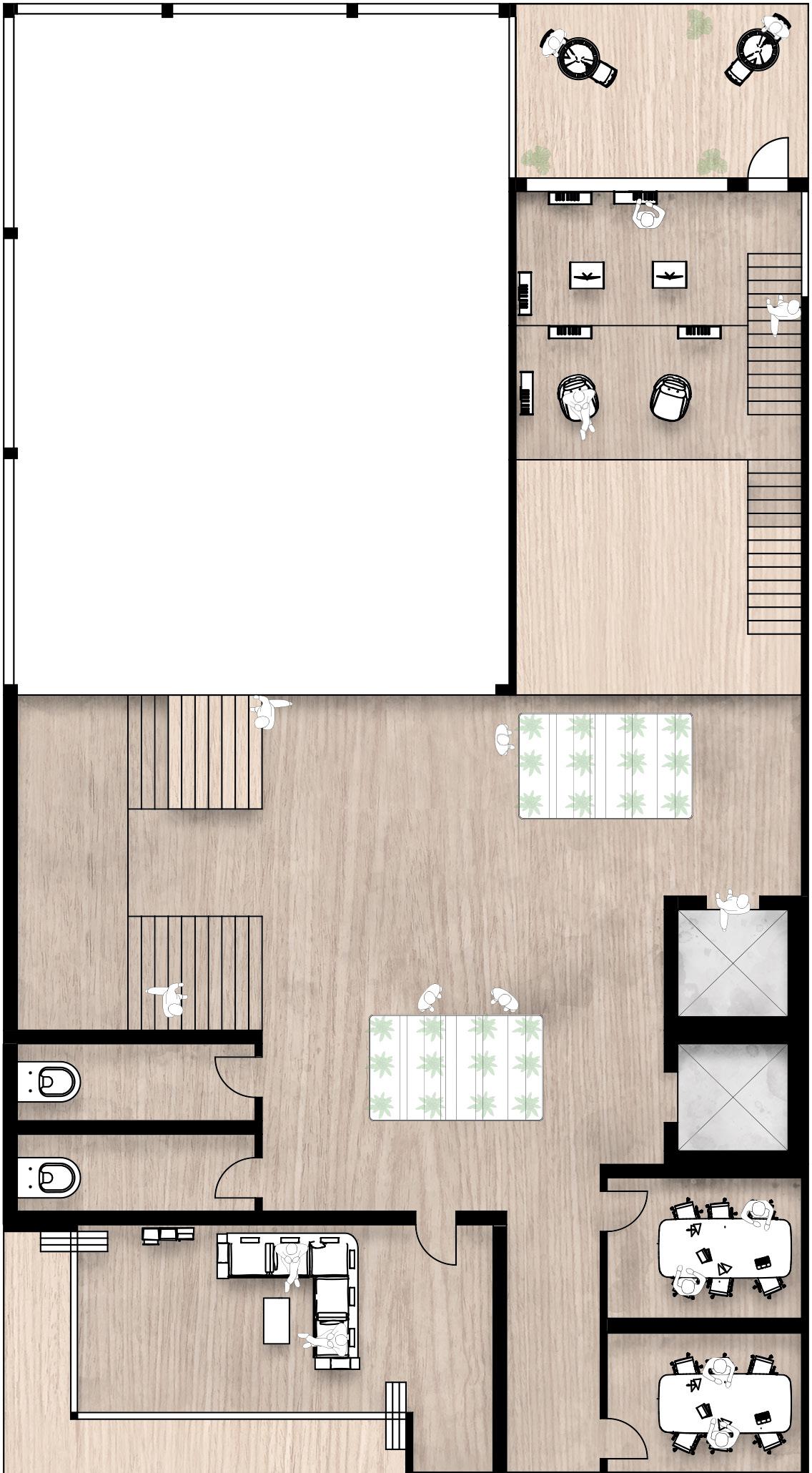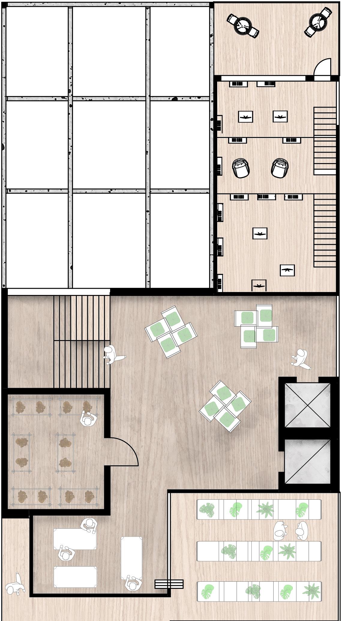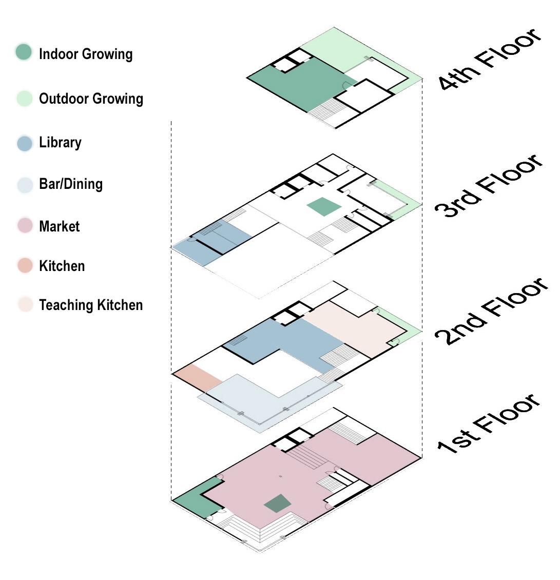 The first-floor market is meant to be an addition to the Columbia City Food Market held on Sundays. The second floor is the beginning of the library space with computer desks that bleeds into the kitchen spaces where classes would be held utilizing some of the locally grown foods. The third floor is a space for the employees and meetings to be conducted with the local community. The rooftop is a space to feature the outdoor growing systems and packaging, as well as the vertical, growing wall that drapes down the southern wall to maximize the sun.