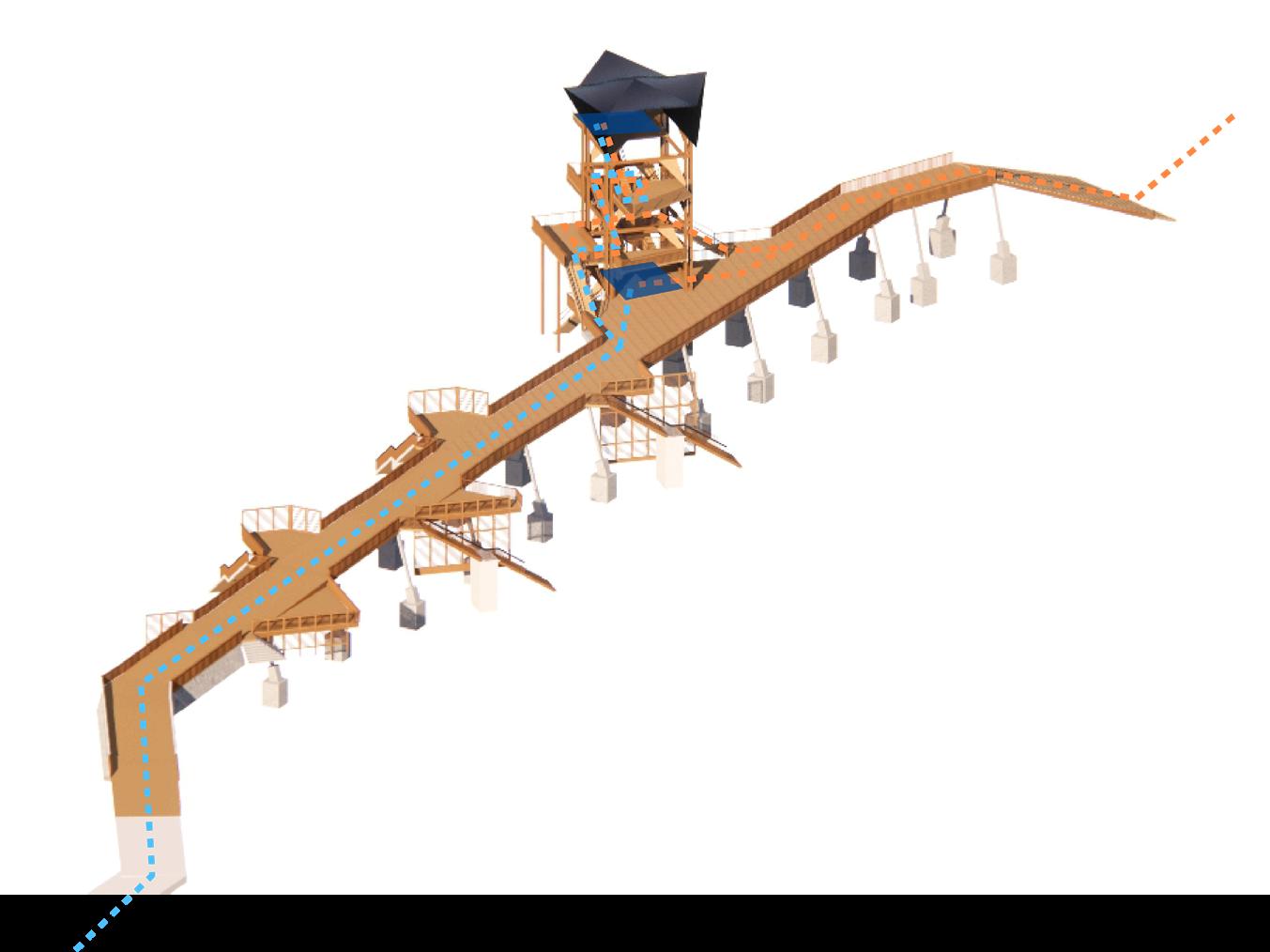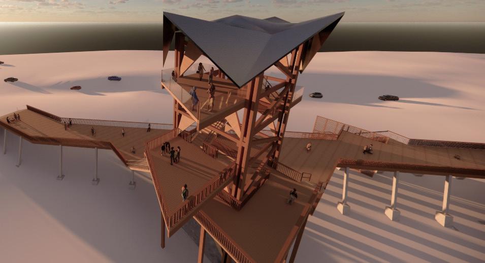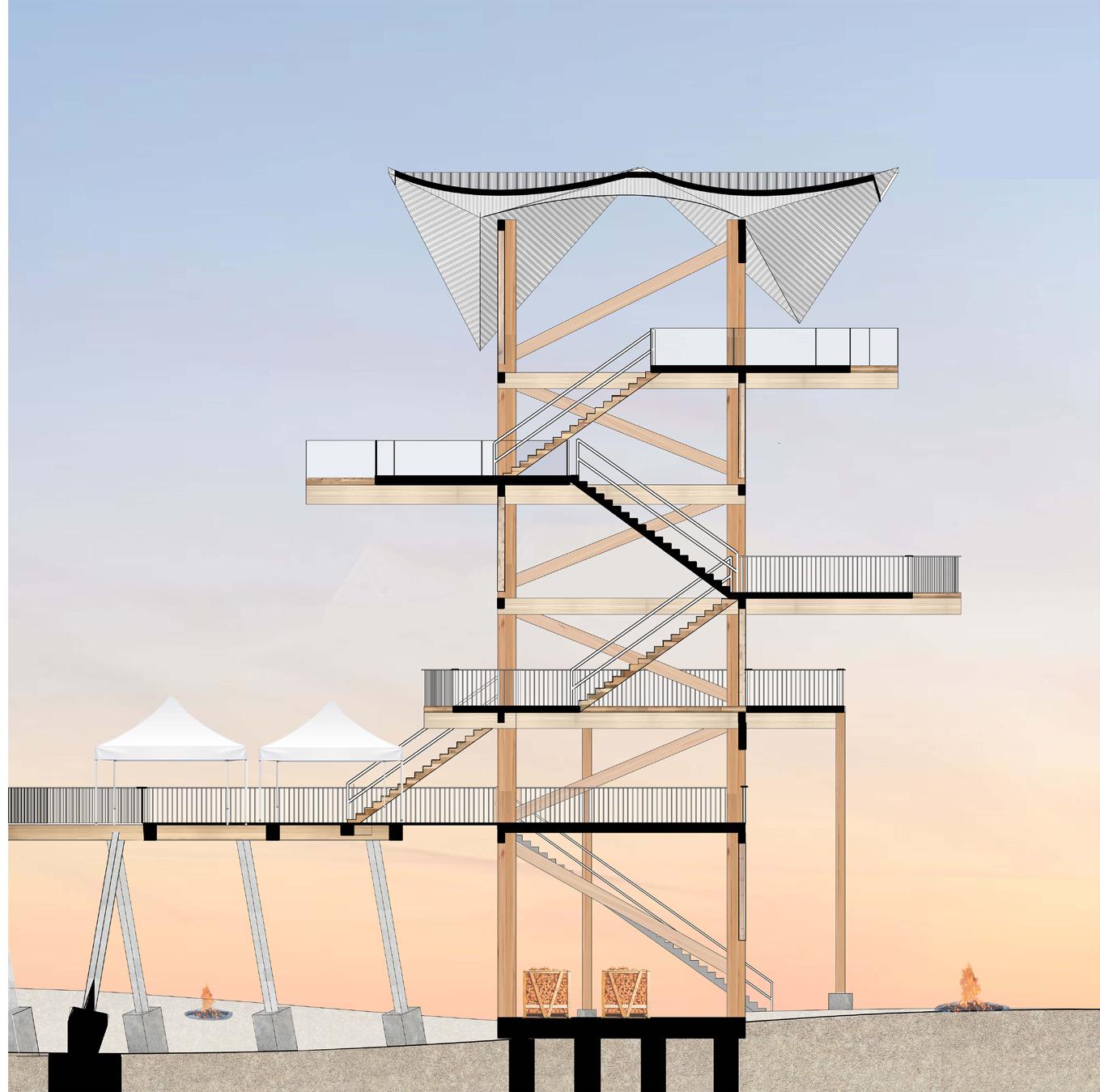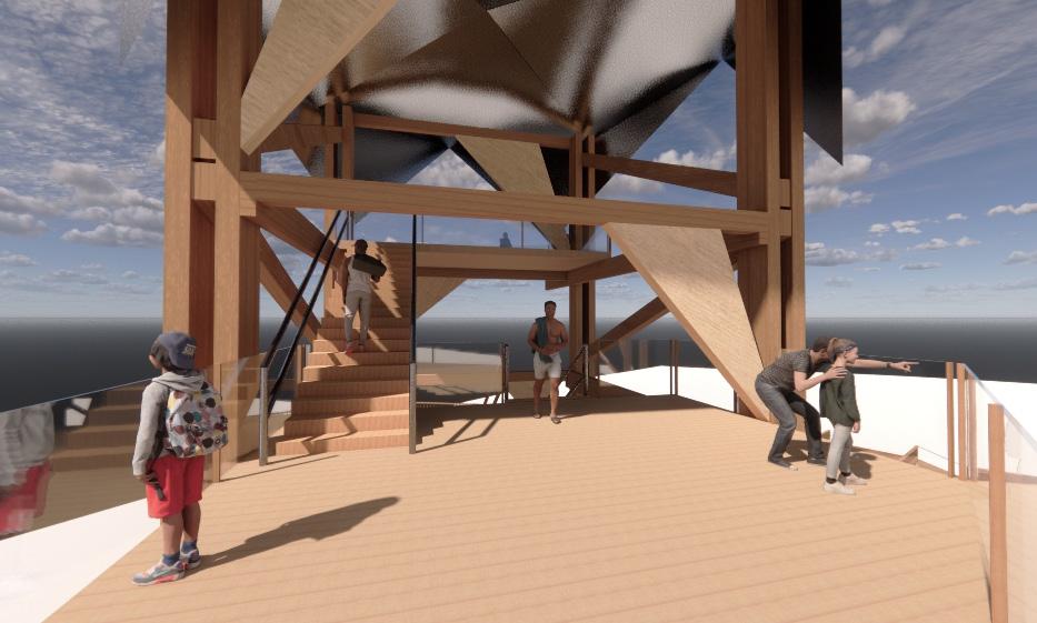 One encounters multiple extensions along the boardwalk that gives users a moment of rest and pauses to admire the vast horizons. Once you’ve arrived at the base of the tower you witness the elements of the mass timber that makes up the structure. The material that defines the warmth of the tower guides you as you get closer to the top.