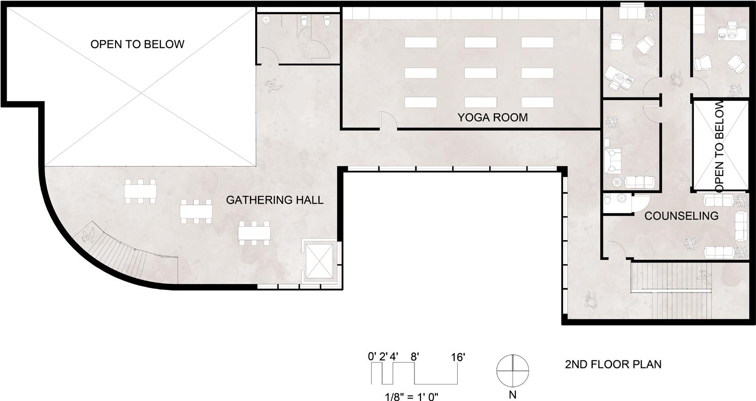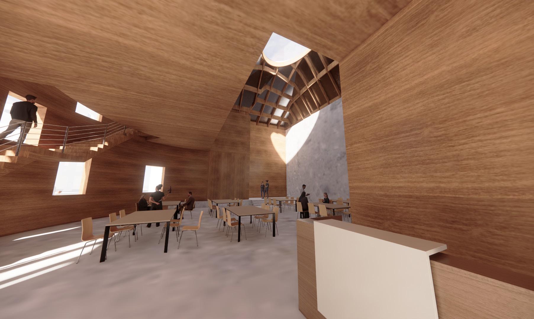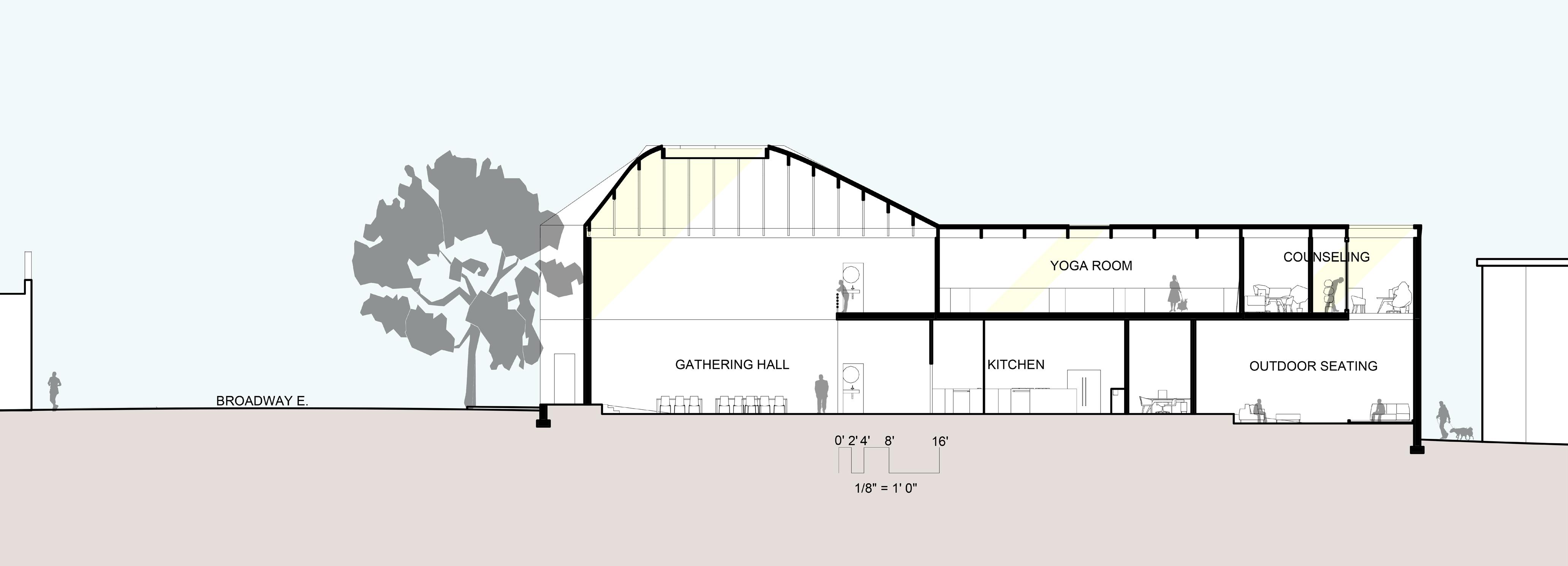 The Capitol Hill Resilience Hub is located at the intersection of East Mercer Street and Broadway East in Capitol Hill Seattle. CHRH is designed to provide the community with a space for various celebrations from mental health to national heritage months. The form and orientation of the wooden structure maximize the summer winds and capture the southern light in dynamic ways. The space features a two-story gathering hall connected to the kitchen for quick service on the side closer to broadway. As the user navigates further east, they will encounter a yoga room that is utilized in conjunction with the counseling space as physical exercise has been proven to help the mental state. Behind the yoga room lies a counseling space that is surrounded by immaculate natural lighting as it pierces through the horizontal slats.
