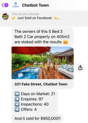 We analyse market data in your selling suburb to create custom Monthly Suburb Reports for your brand We showcase this report to your Messenger List to fish for appraisals & listings within that suburb. We also create custom appraisal reports when potential seller enquiries come through your Chatbot for hyper-personalised service & experience