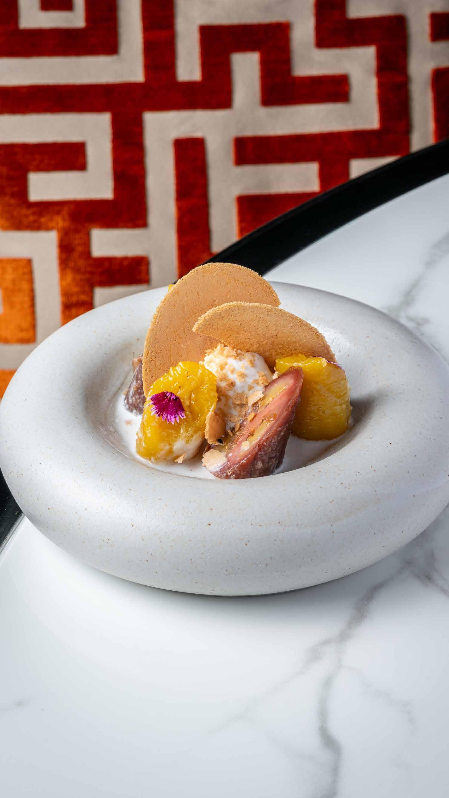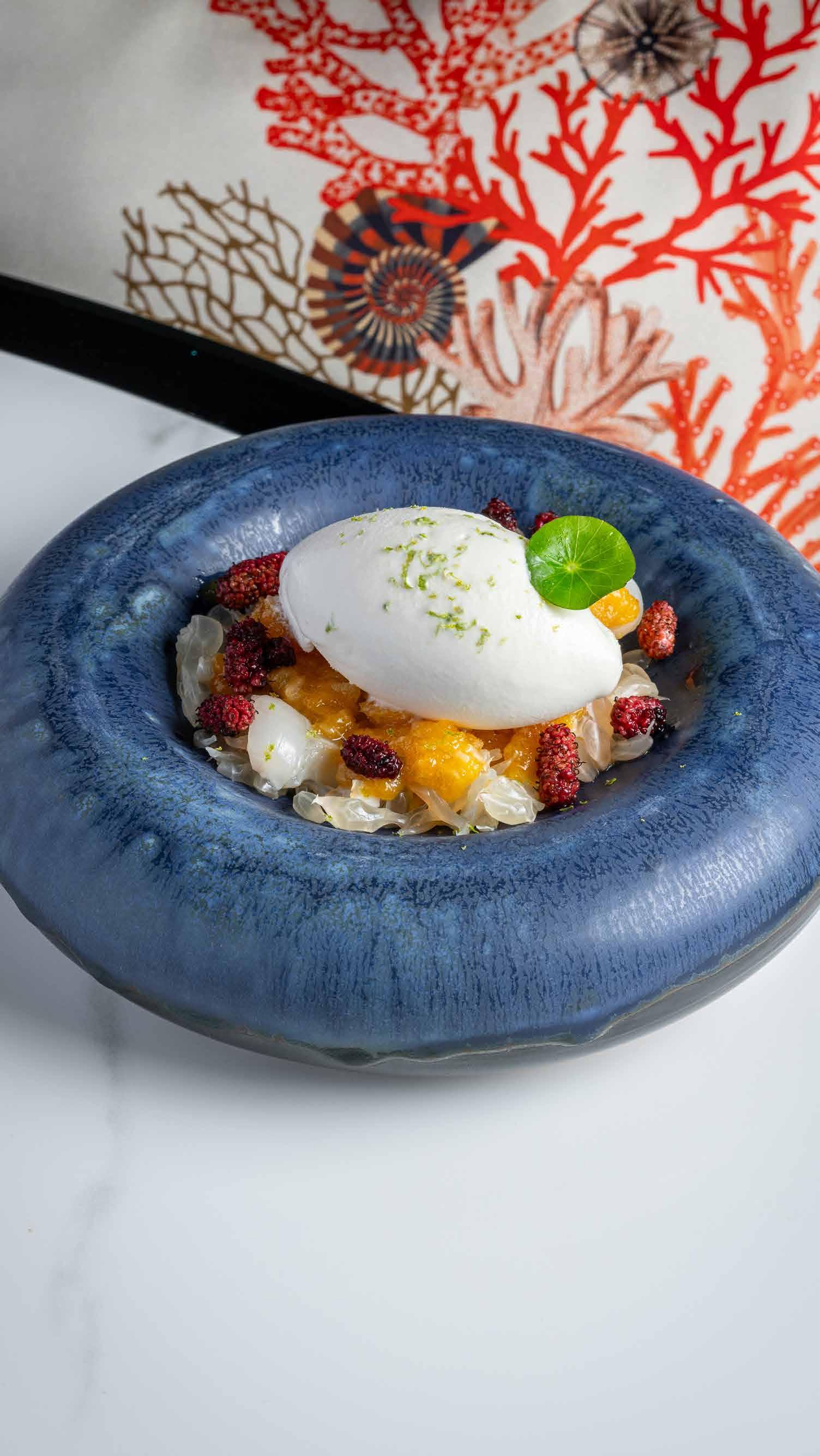 Seasonal Fruits with Jasmine-Poached Mulberries, Orange Granita and Wild Honey Yogurt Sherbet