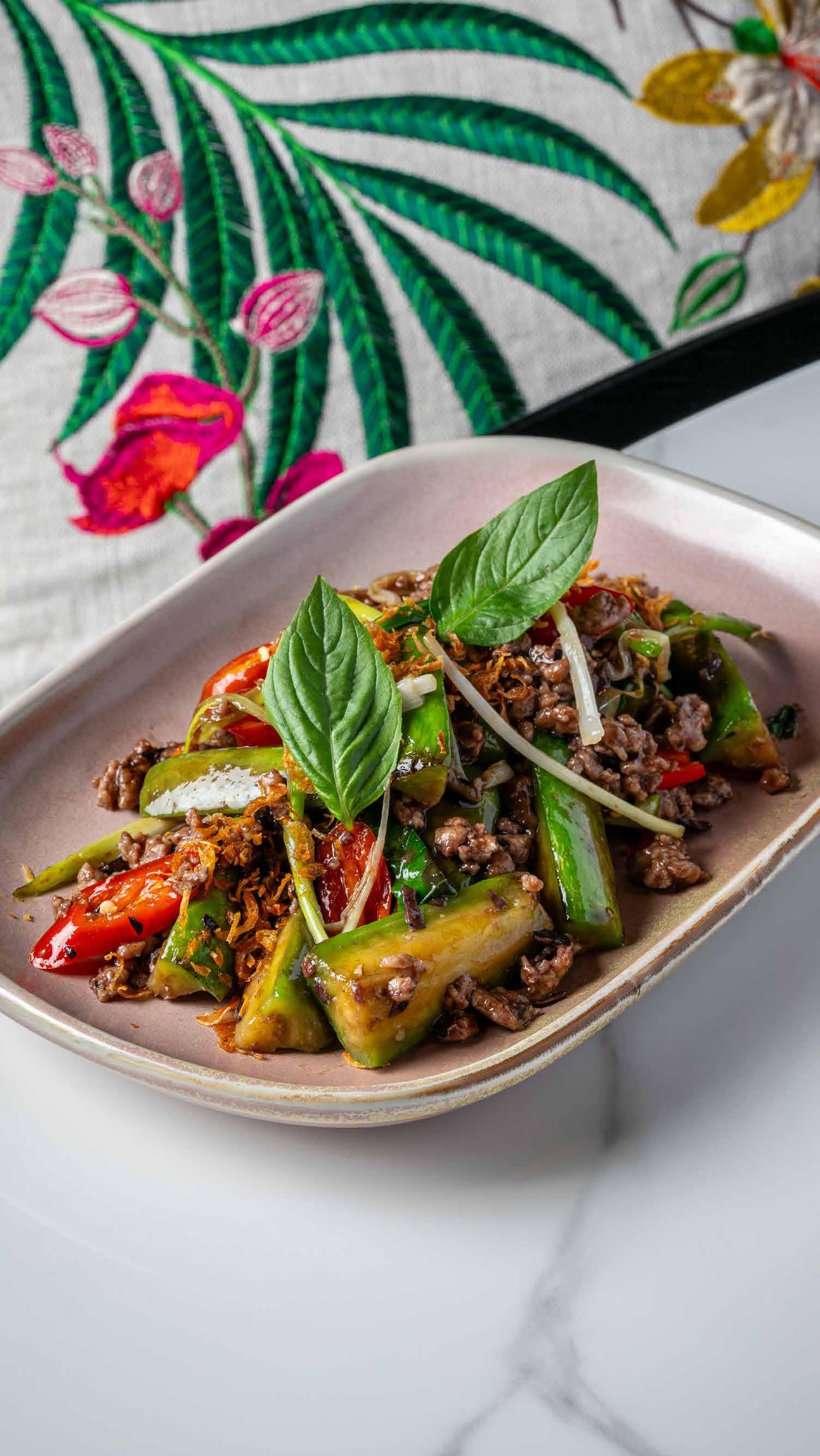 Charcoal-Seared Beef Tenderloin Infused with Thai Spices, Complemented by the Bright Aromatics of Lemongrass, Galangal, Fresh Lime and Finished with a Refreshing Blend of Fresh Herbs