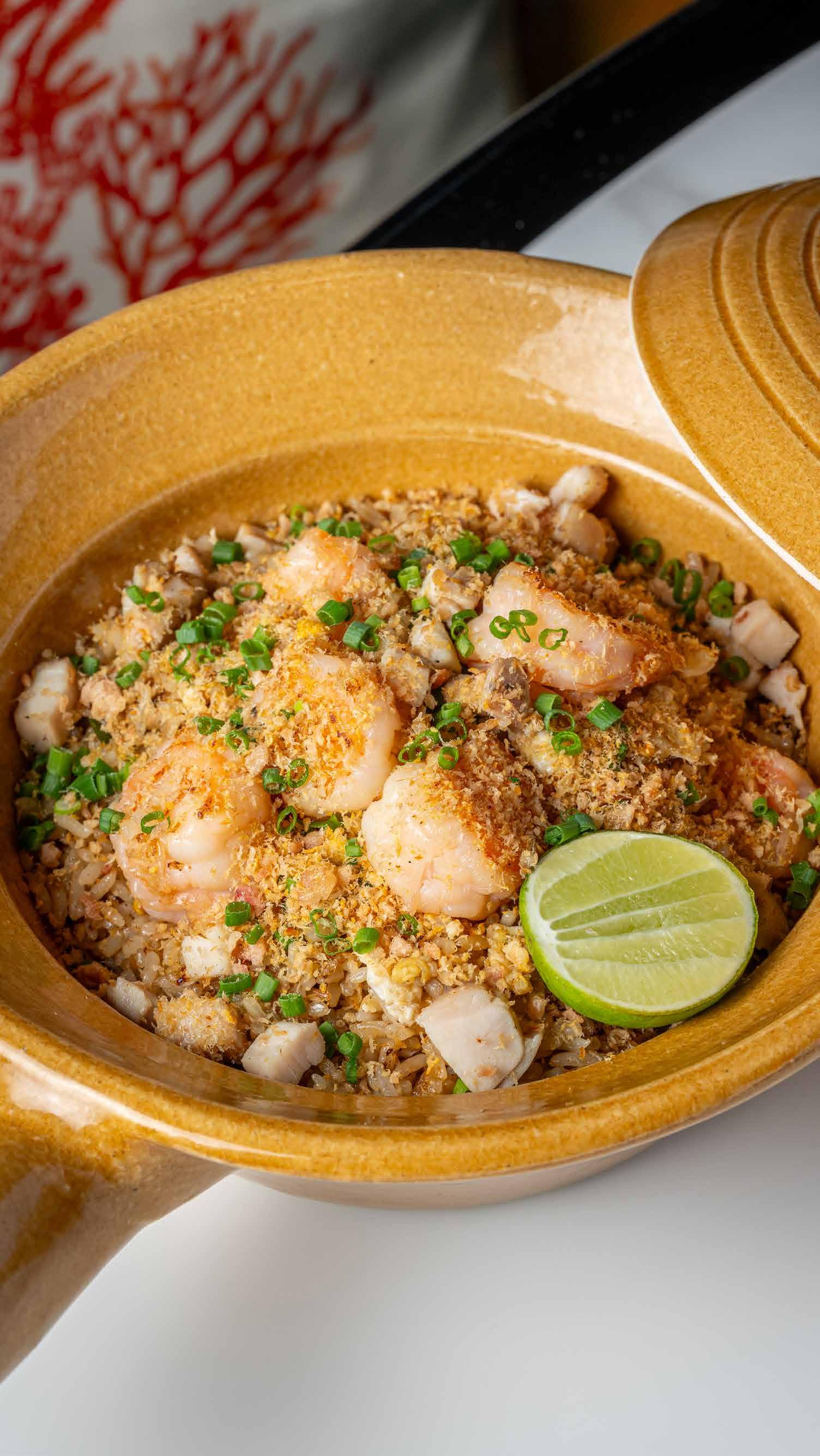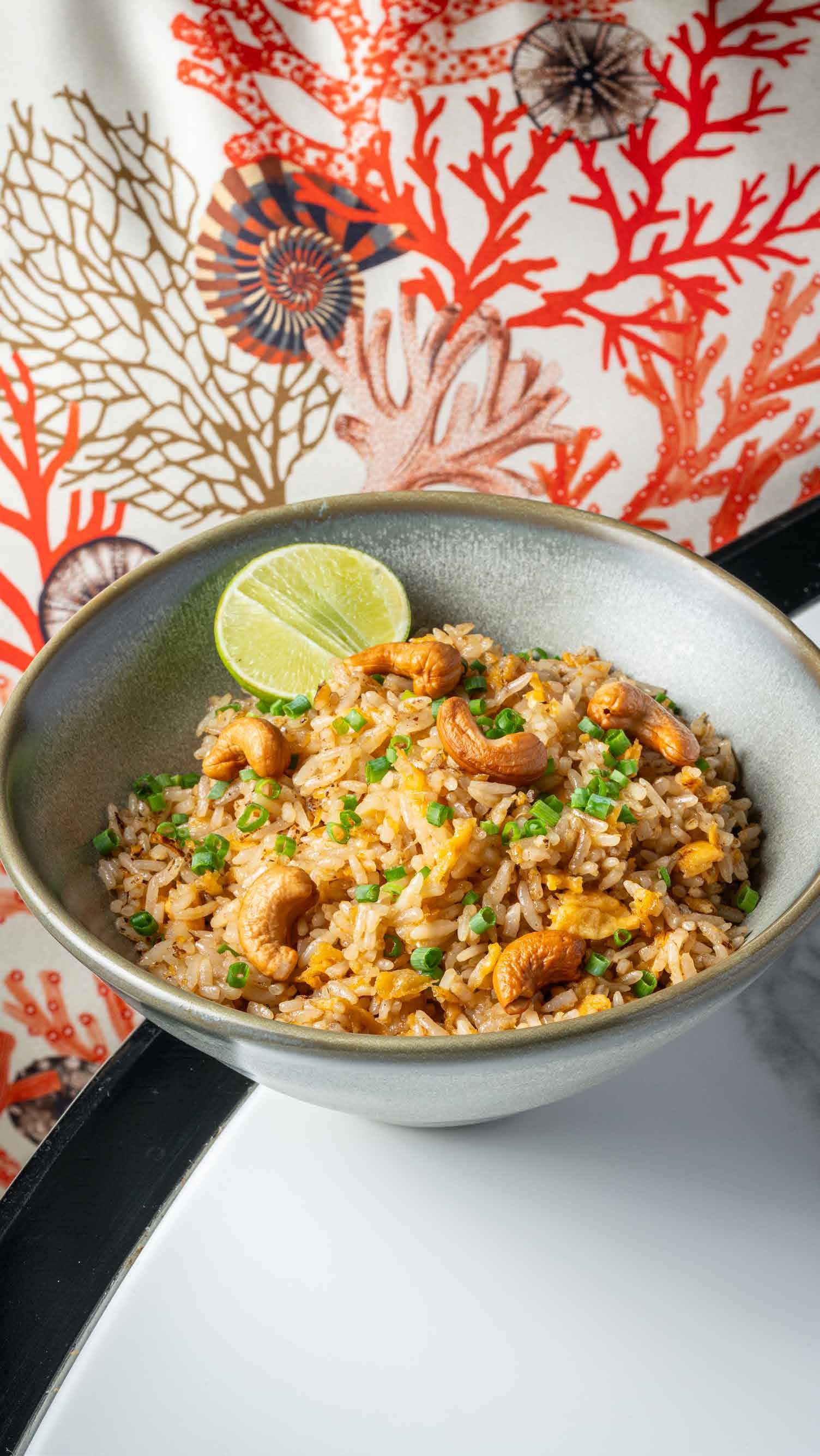 Yaowarat Labor Street Fried Rice -- Aromatic Wok-Smoked Fried Rice Inspired by the Bustling Street Stalls of Yaowarat, Stir-Fried to Perfection with Free-Range Chicken, Baby Shrimps and Ayutthaya Salted River Fish