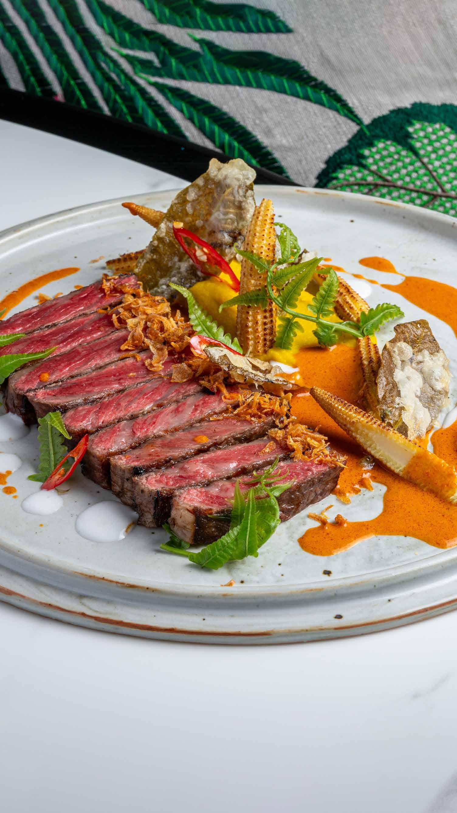 Char-Grilled Wagyu Beef Striploin (Marbling Score 6–7) with Salted Coconut Cream and Tamarind-Spiced Curry, Served with Pumpkin Purée, Wild Vegetables and Grilled Baby Corn