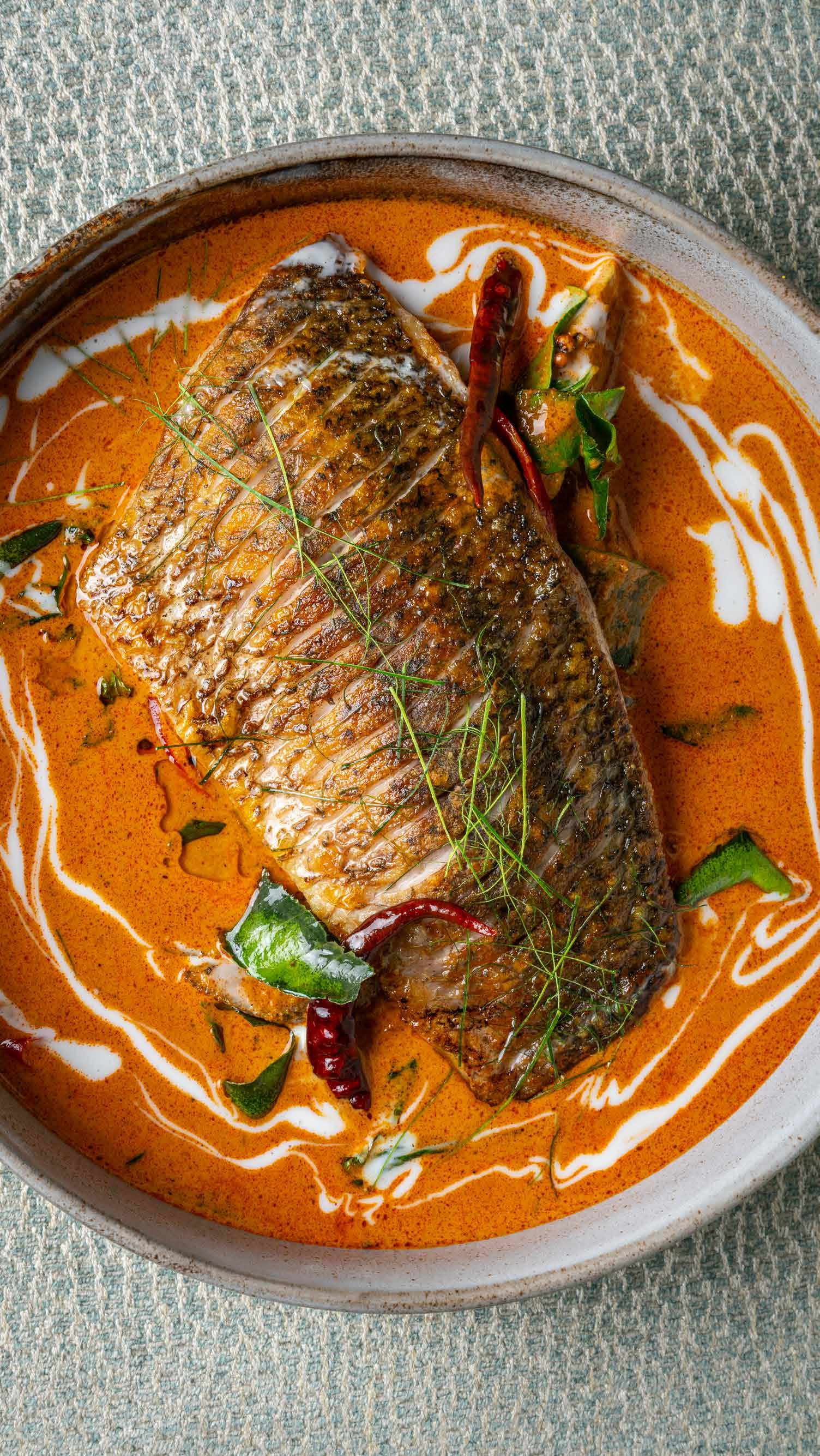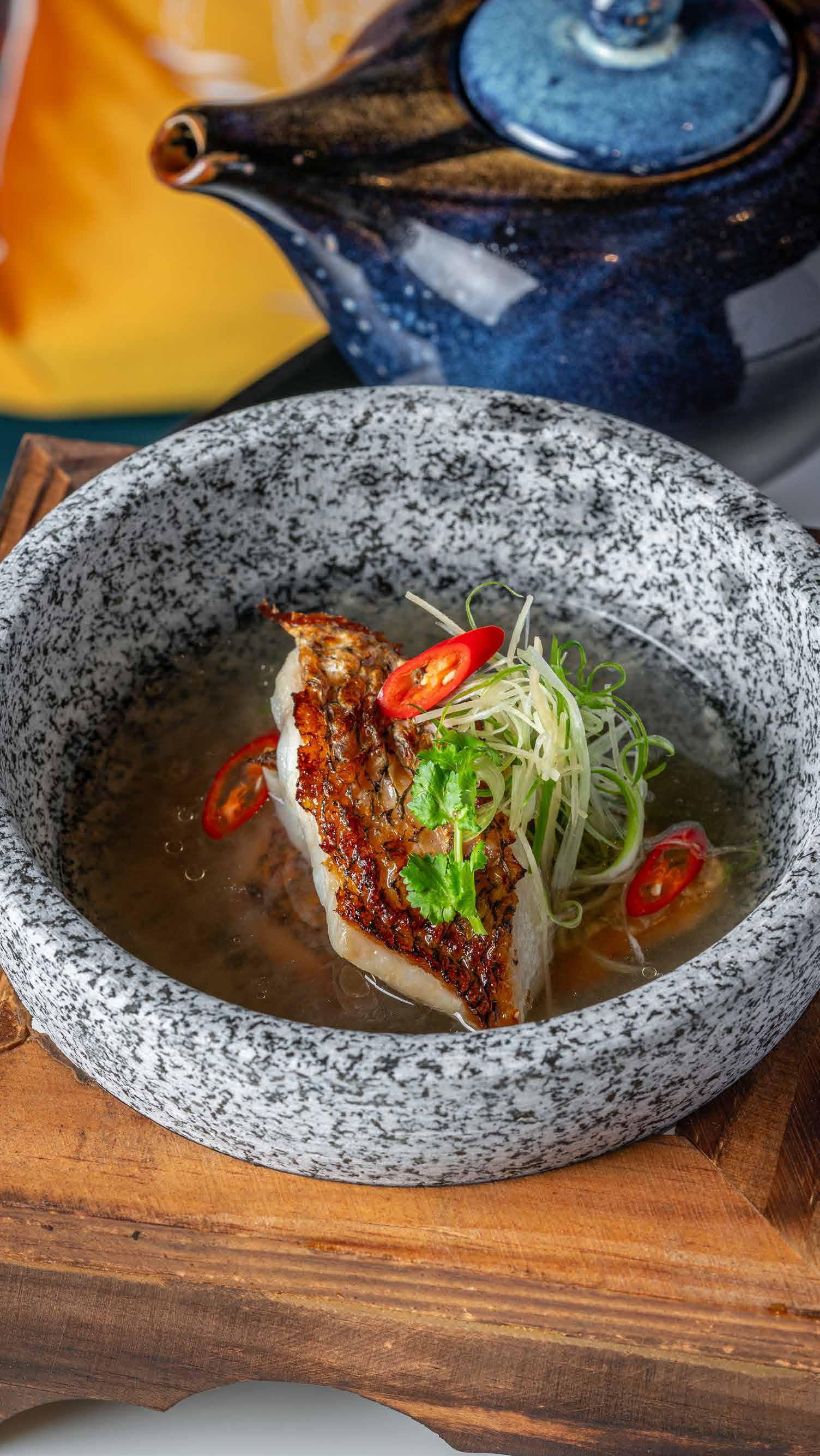 Isan-Inspired Herbal Clear Soup with Line-Caught Andaman Fish of the Day, Balanced with the Sweet Tang of Tamarind Paste and Fresh Herbs