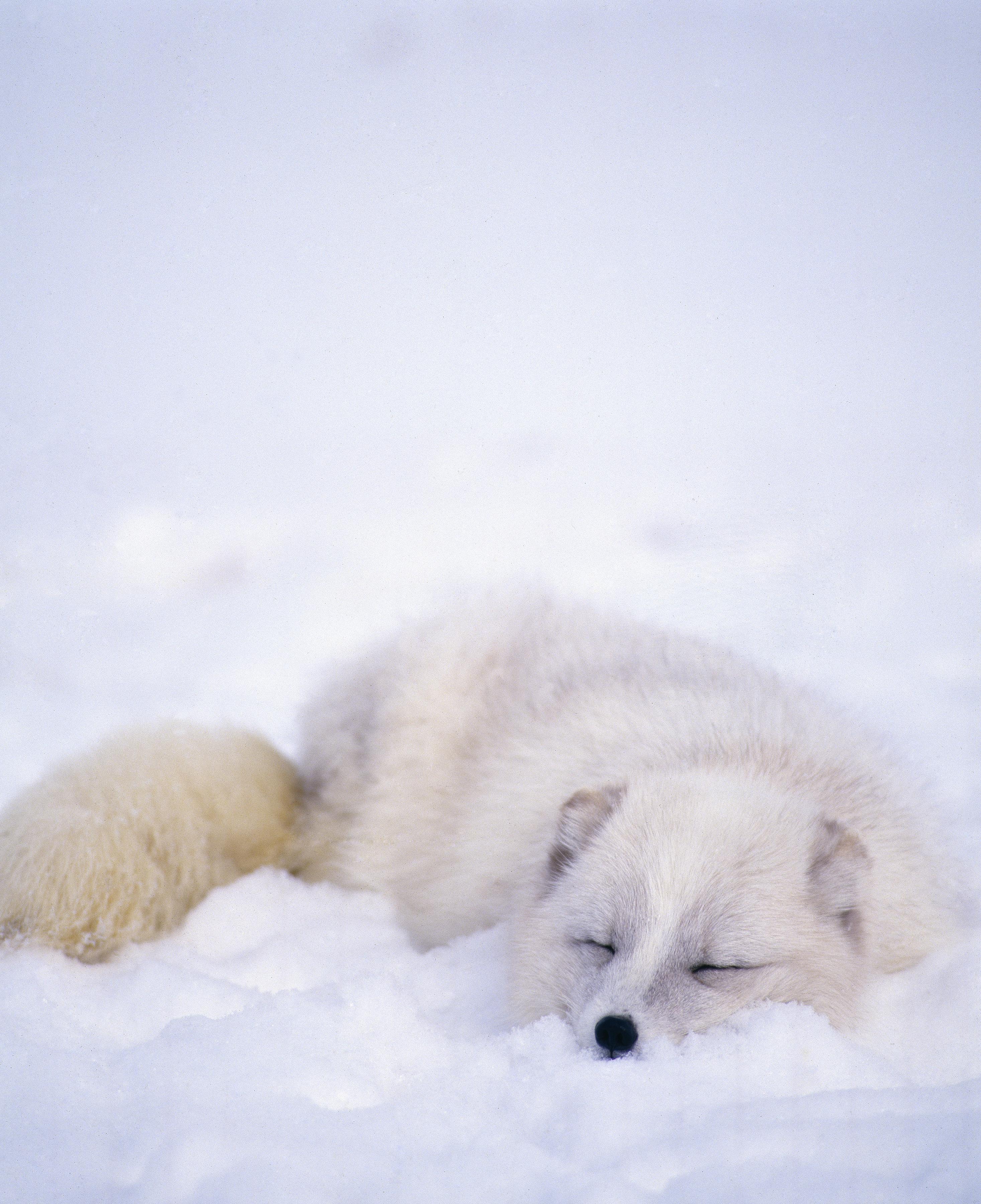 This page: An Arctic fox sleeping in the snow.