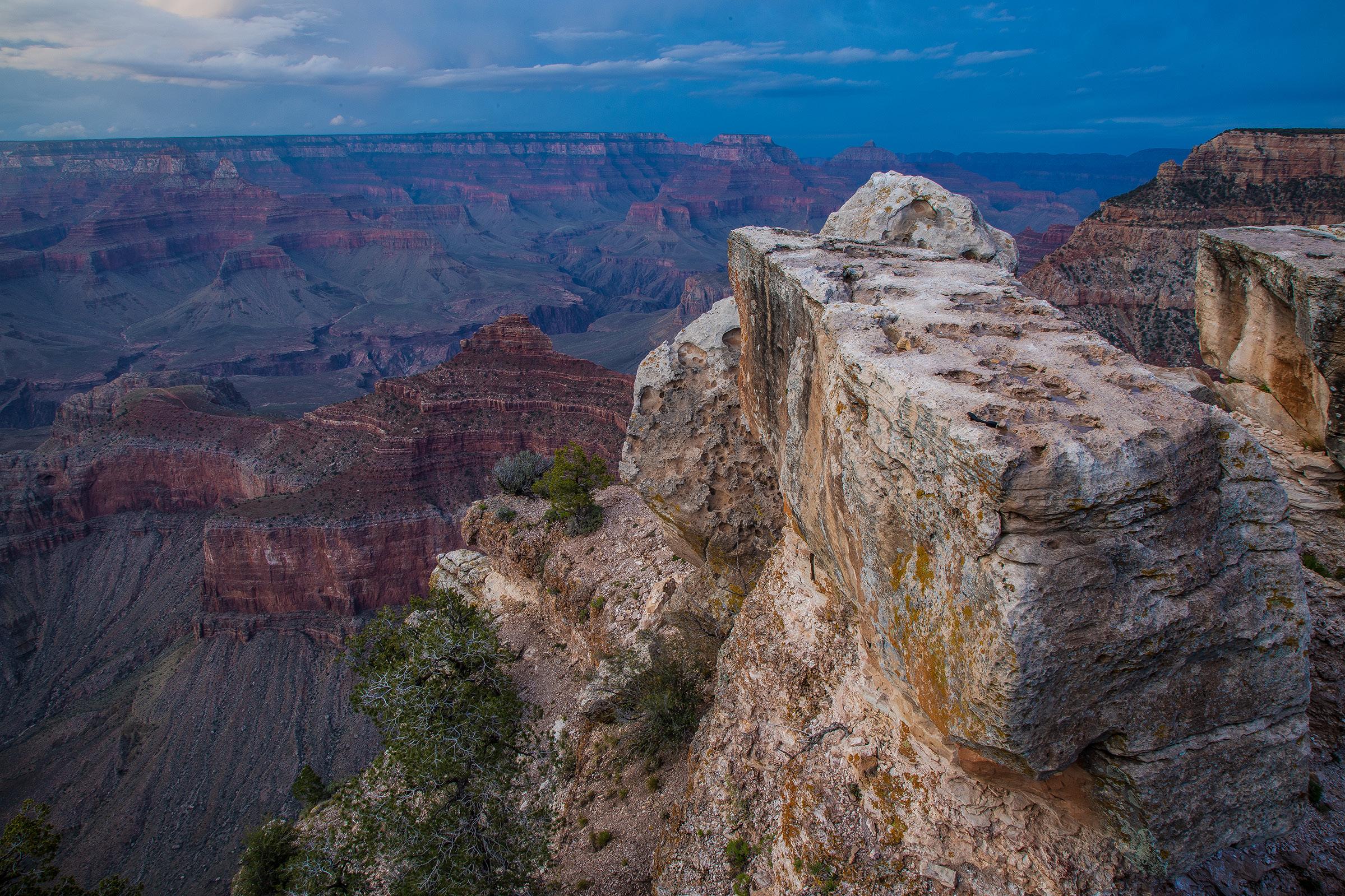 Some photographers think if you leave the white balance on daylight all the time, as I do, the pictures will turn out bluish when shooting in overcast conditions and at dusk and dawn. That does happen, of course. You can see in the shot of the Grand Canyon, below, that an approaching storm darkened the sky significantly and raised the Kelvin temperature (the higher the temperature in degrees Kelvin, the bluer is the picture). In this situation, you can either use cloudy white balance, which will remove much of the blue tone, or continue to use daylight WB and accept the blue coloration. Sometimes you'll like it and sometimes you will want to remove the bluish cast in post-processing. Personally, I find often the blue color adds mood and atmosphere so I keep it.