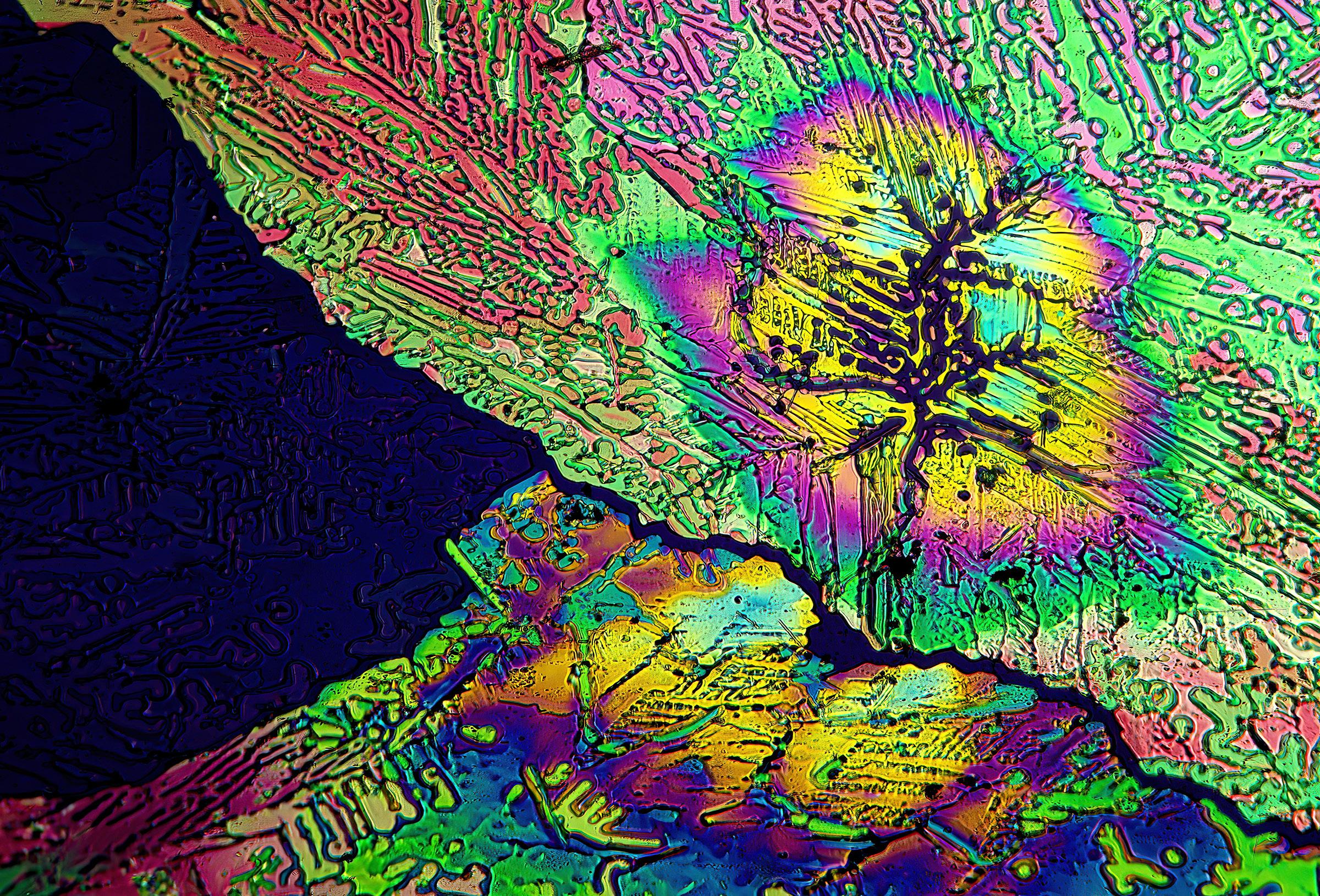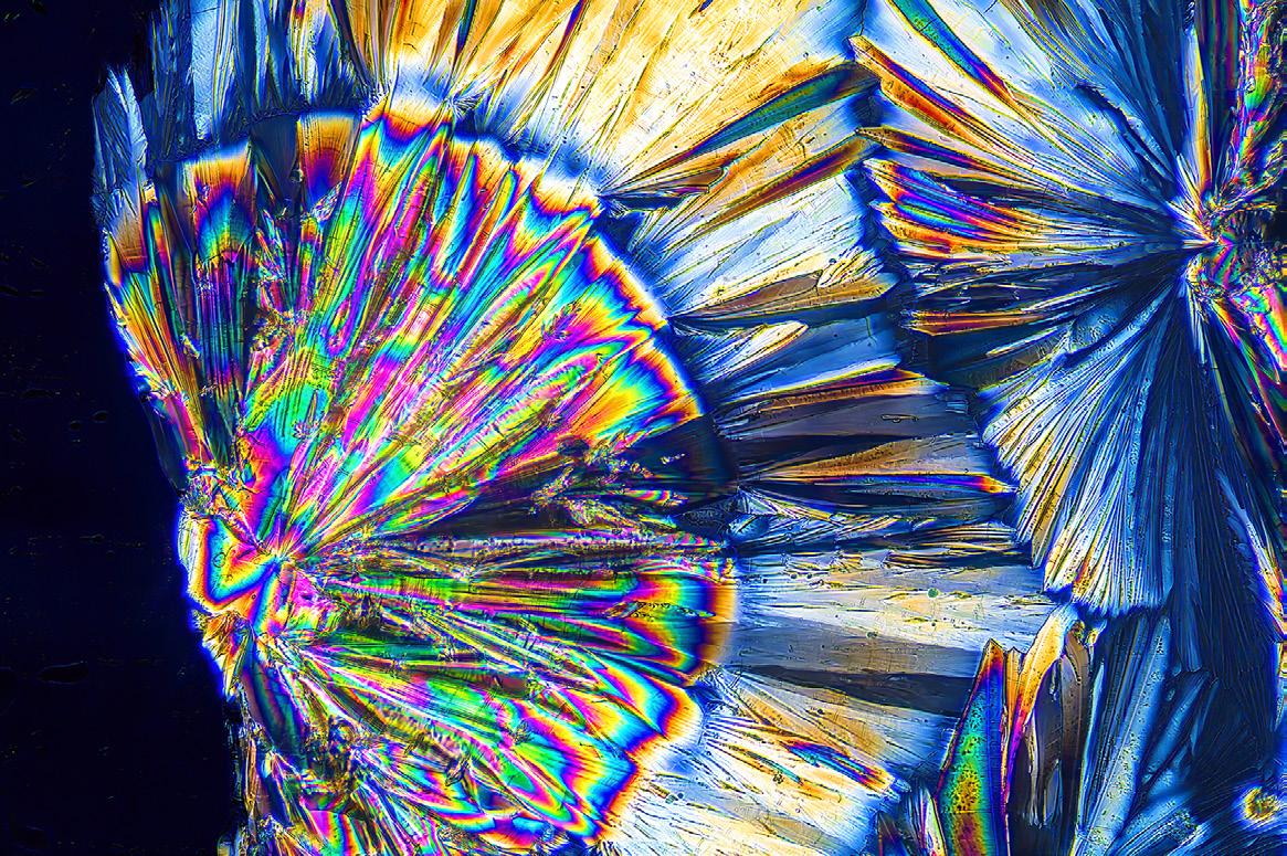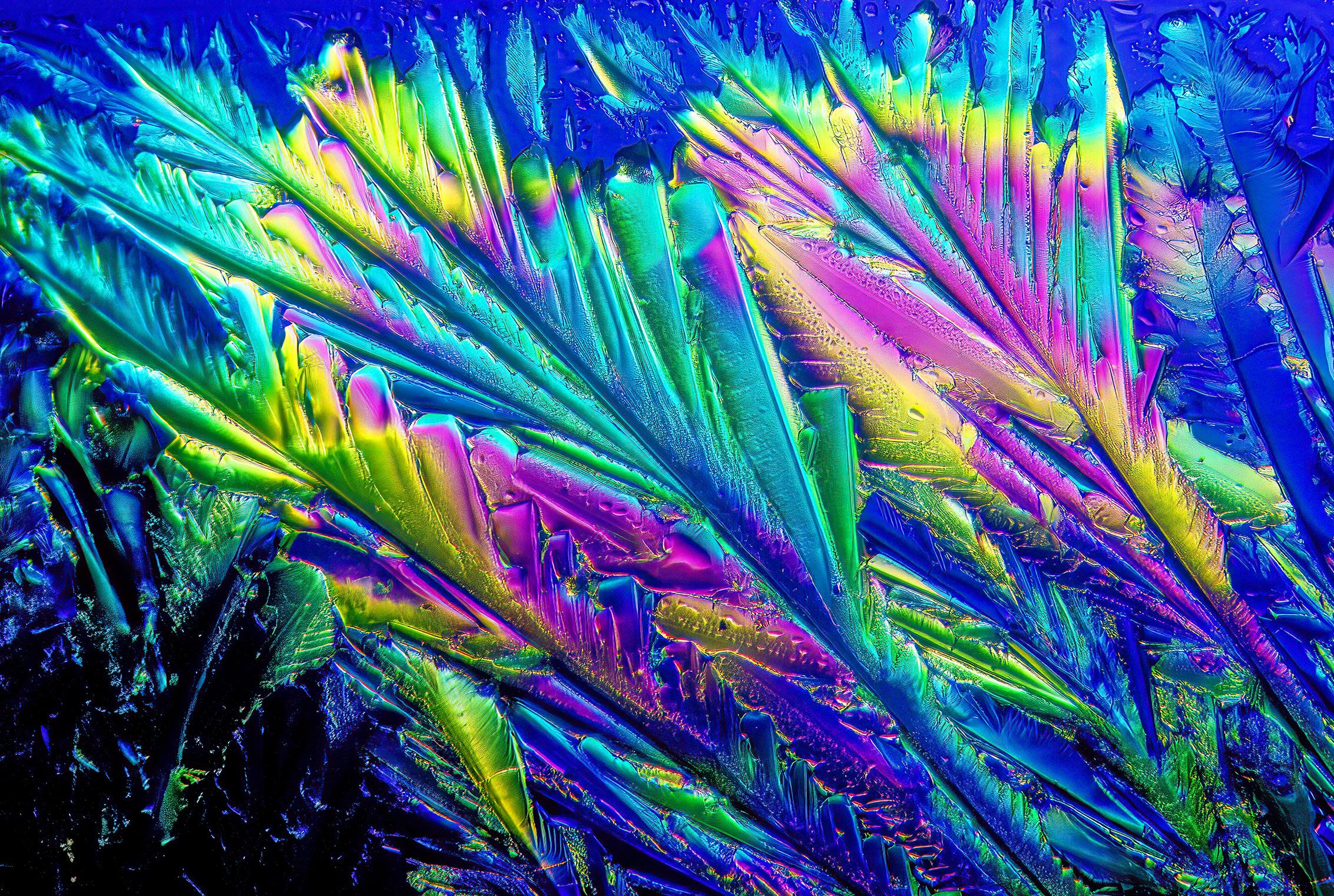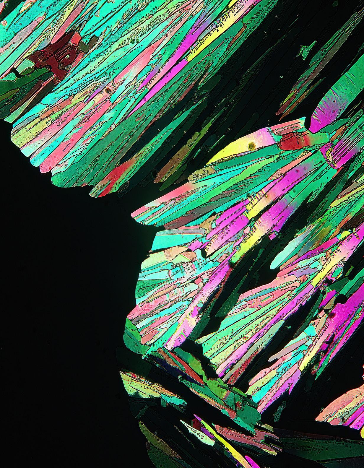 The chemicals that produce the colors you see in this article are called birefringent. That means when the crytals are viewed through two polarizing filters they become ablaze