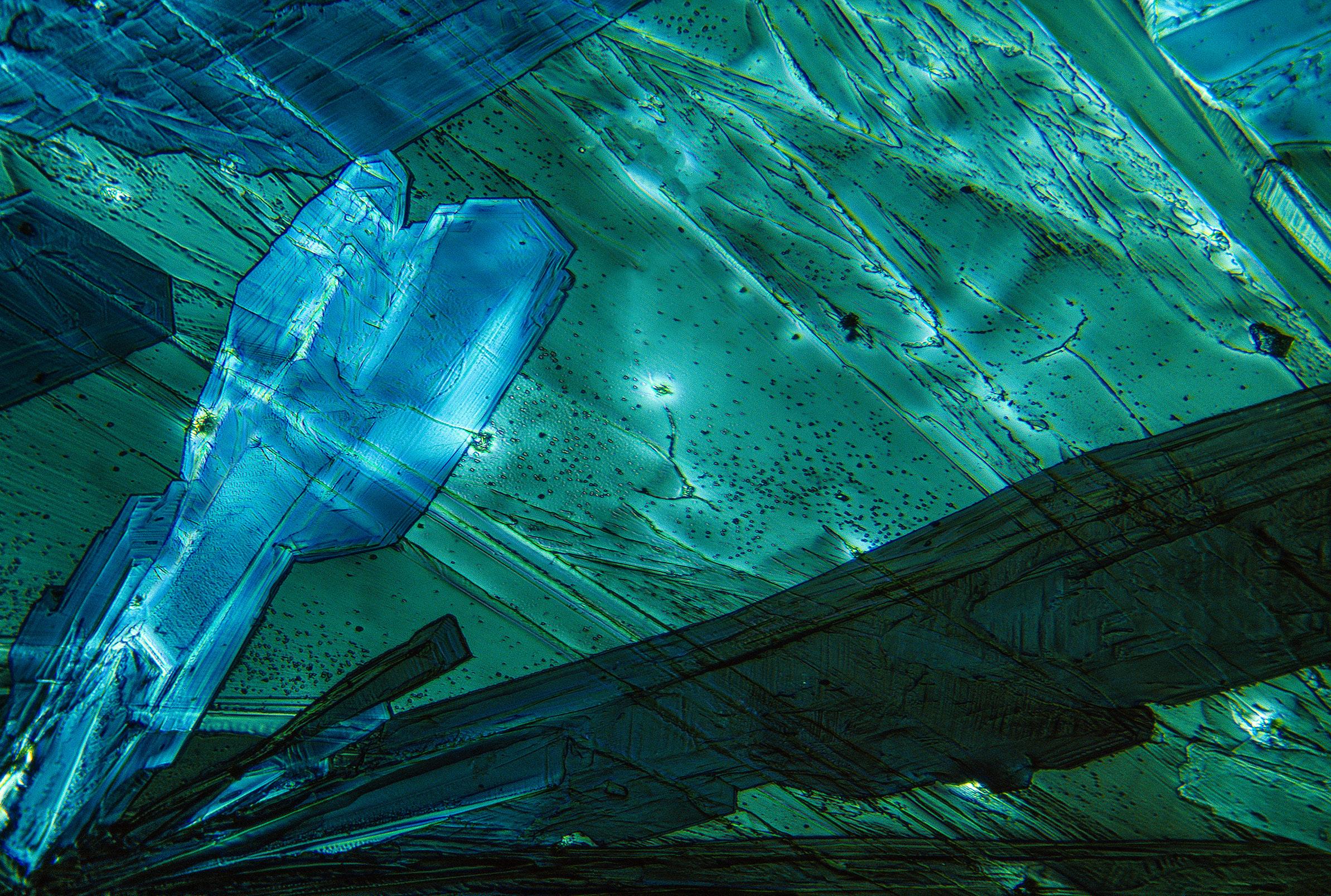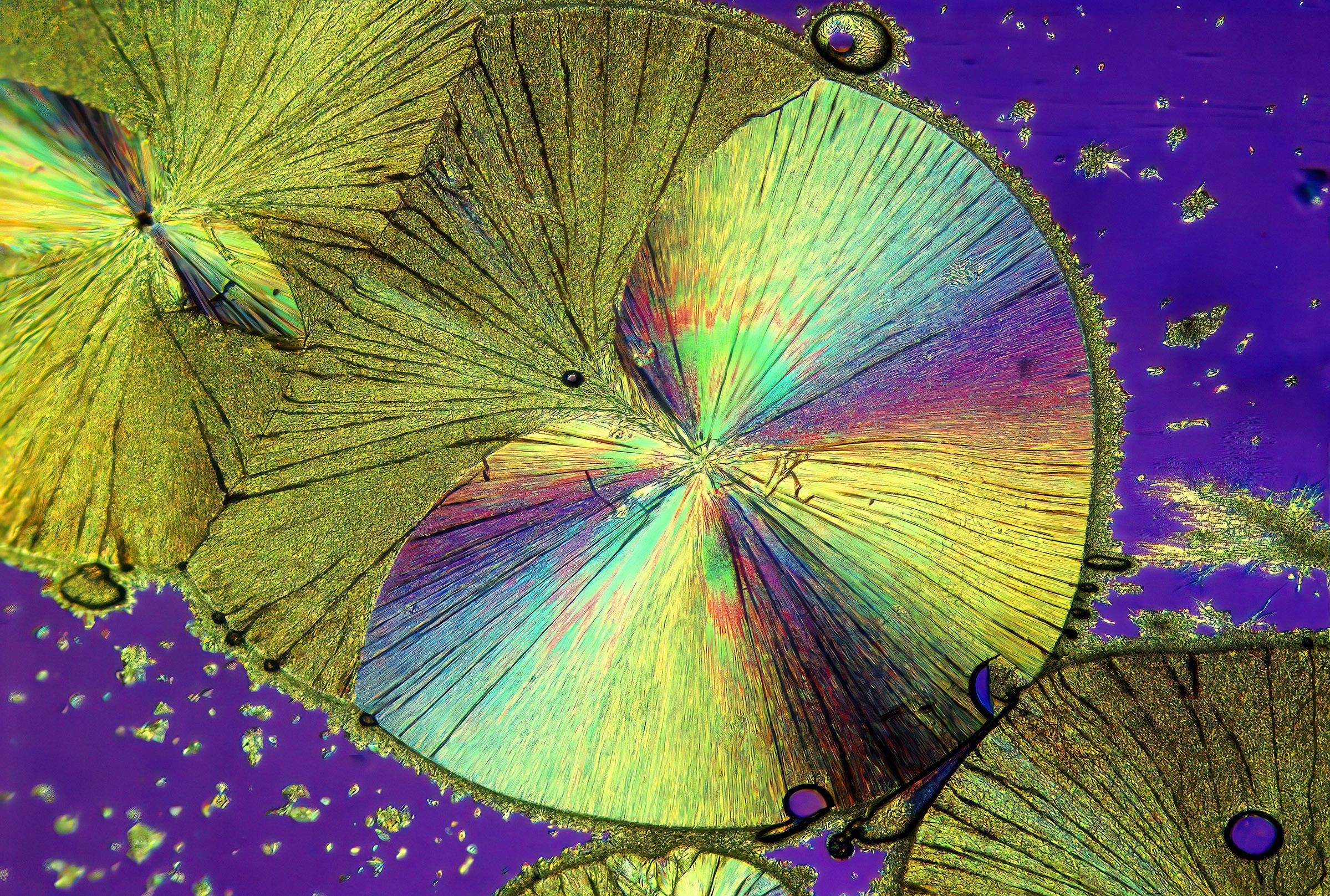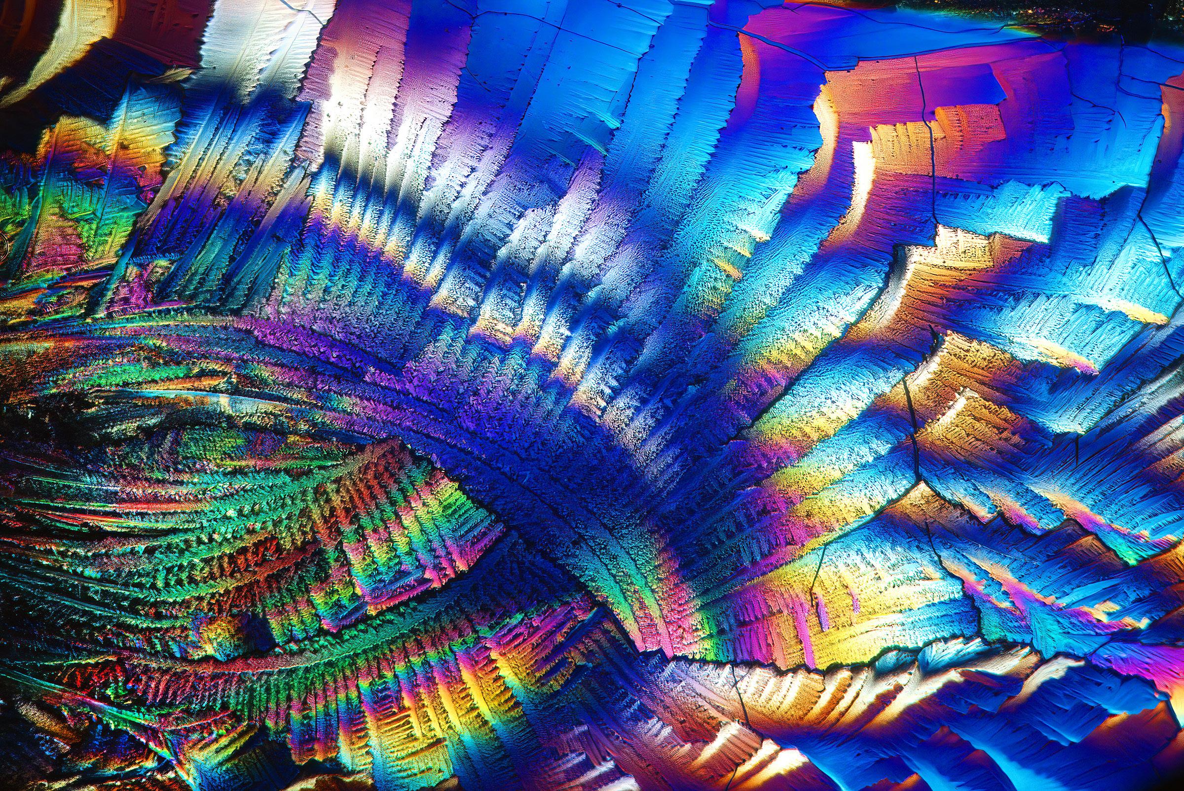 The chemicals that produce the colors you see in this article are called birefringent. That means when the crytals are viewed through two polarizing filters they become ablaze