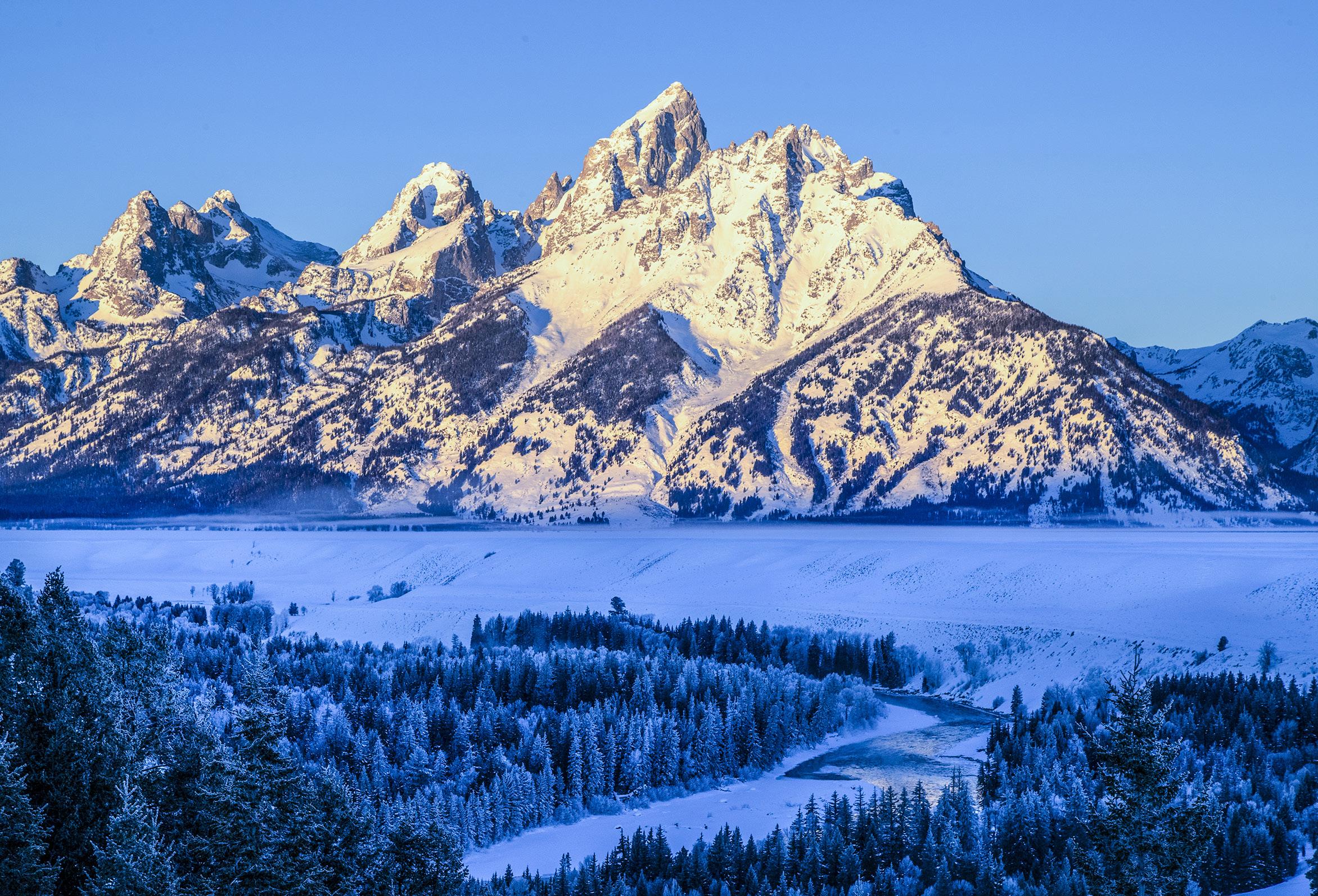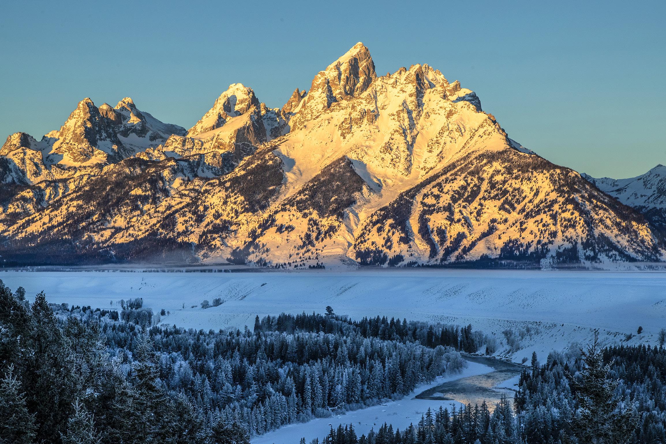 When the sun is close to the horizon at sunrise and sunset, the color of the light is golden. Specifically, it is red and yellow. When you set the camera's white balance to daylight, the colors in the photographs will be exactly what you see. The winter shot of the Grand Tetons in Wyoming, below, is an example The golden color on the mountains in the photograph is exactly what I saw when I was standing there taking the picture.