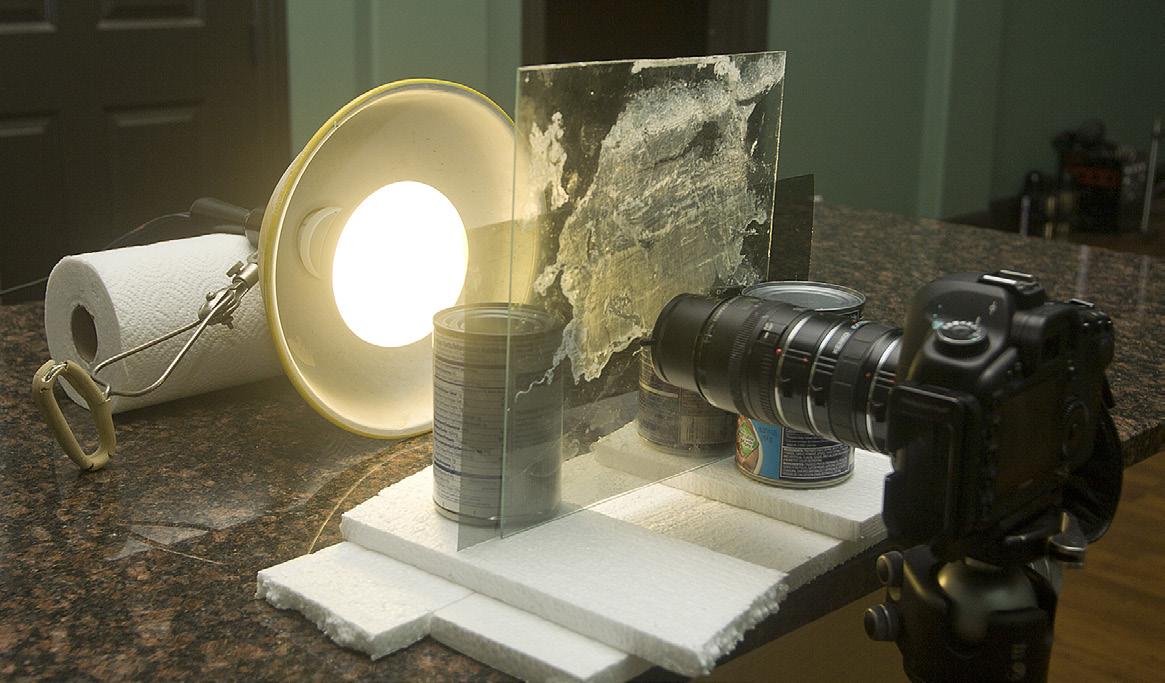 If you look closely you can see the sheet of polarizing material between the photoflood and the glass. I just leaned it up against the glass. On the front of the macro lens I used a screw-in polarizing filter.