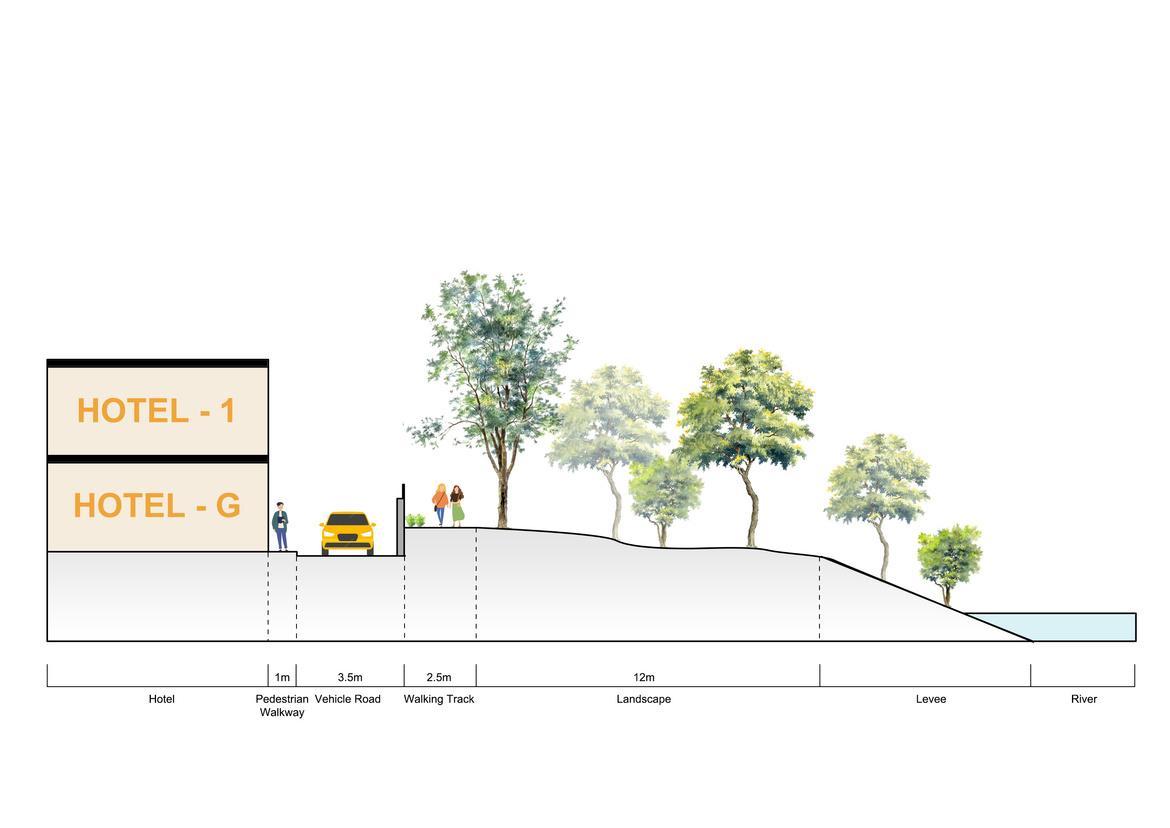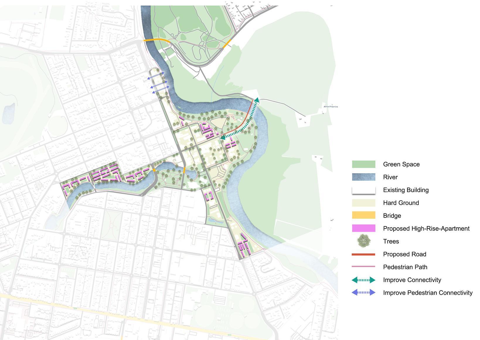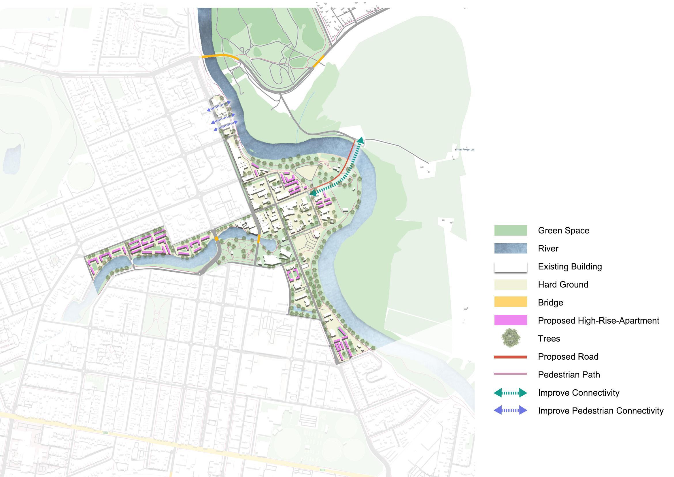 With the CBD as the focal point, the proposal includes adding high-rise apartments, some of which are situated near the river, to create convenient and comfortable living areas.