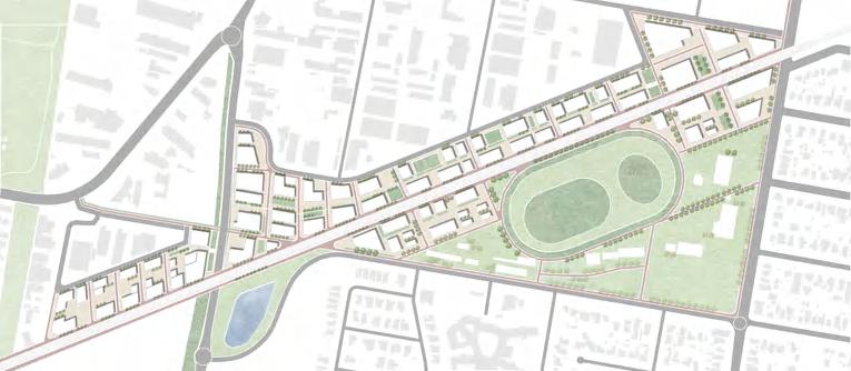 The proposed design elevates the railway, allowing pedestrians and cyclists to traverse the site through a green corridor beneath the tracks, thereby enhancing connectivity.