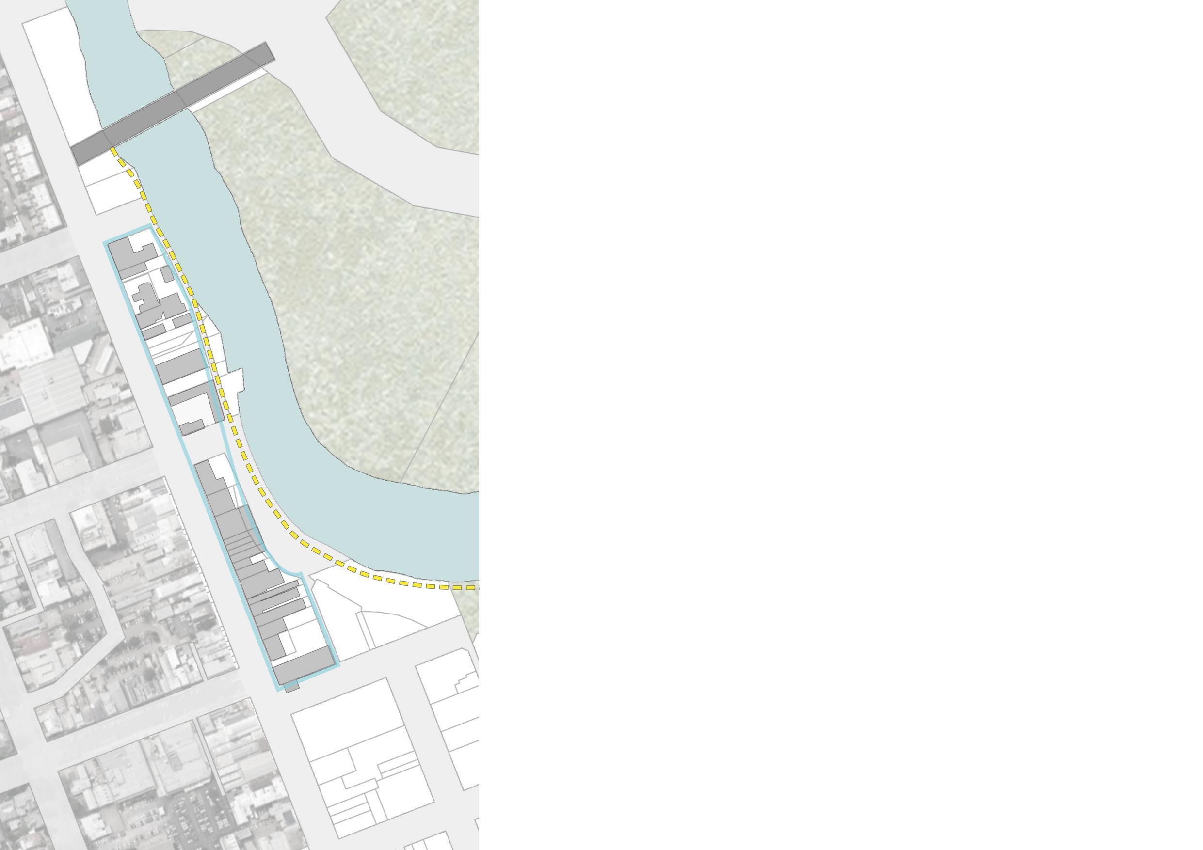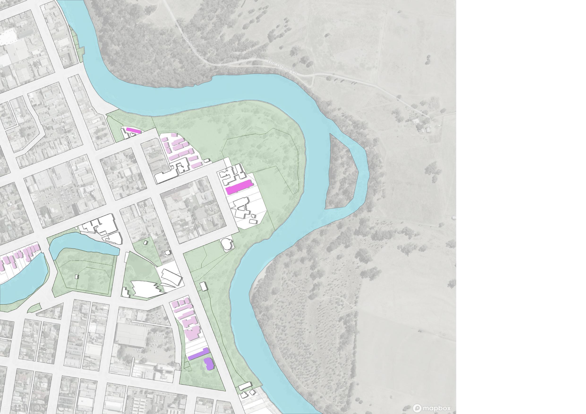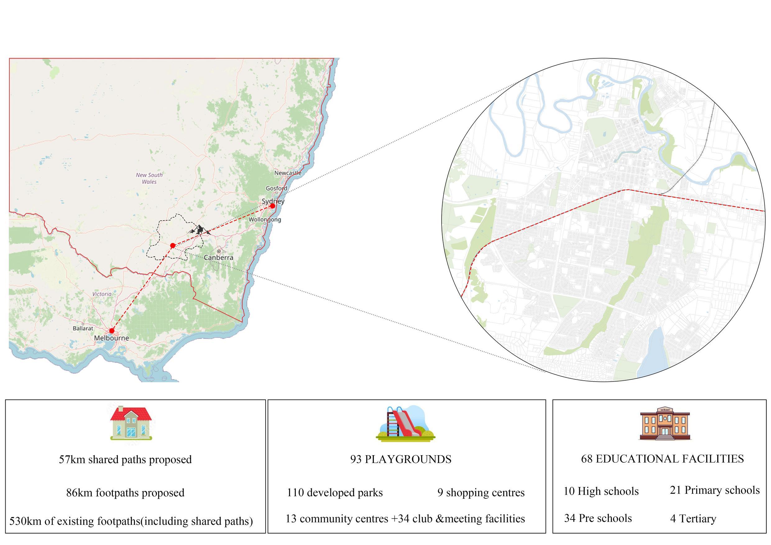 The site is located in the CBD, which has many public service facilities, education, and different types of building uses. However, the existing footpath adjacent to the river is not good, preventing pedestrians from directly accessing the river due to the obstructive embankment wall. There is a notable lack of connectivity between the CBD and the Murrumbidgee River North development area. Additionally, the integration of the blue-green network is insufficient.