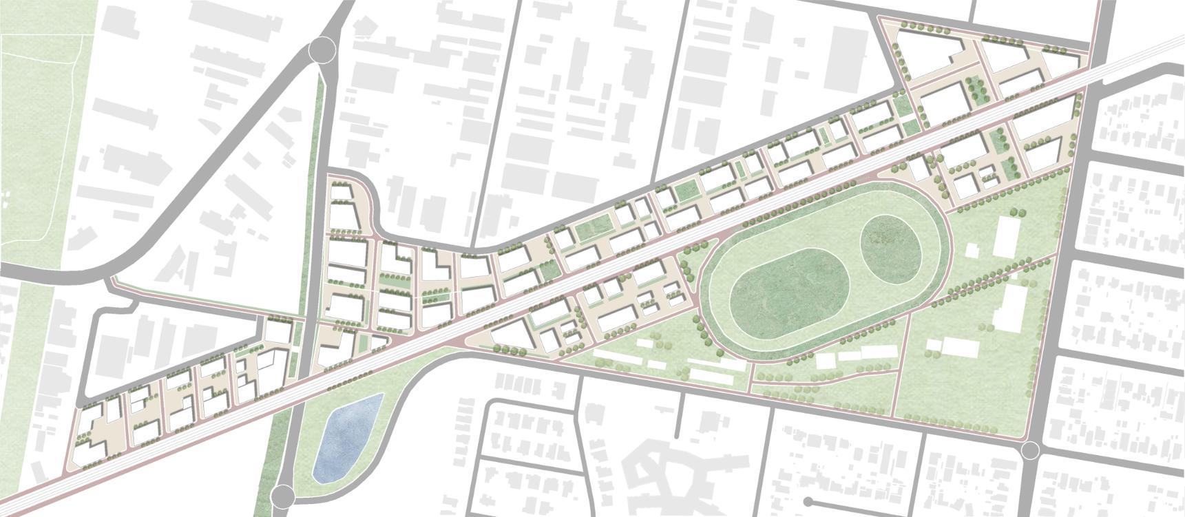 The railway corridor will have a total width of 30 meters. The central 10 meters will be dedicated to the elevated railway, with the ground level below utilized for various community amenities such as children's play areas, skate parks, and other recreational activities for residents.