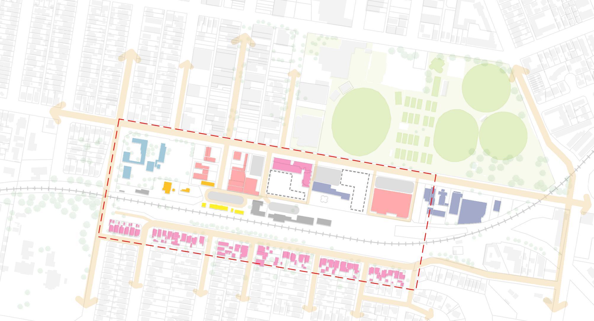 Additionally, mid-size mixed-use office areas will be introduced between the large factory buildings and smaller houses. This will create a smoother transition between different building scales, fostering a more cohesive and integrated urban environment. By addressing these critical aspects, the design aims to enhance connectivity, provide necessary amenities, and create a more integrated and functional urban landscape.