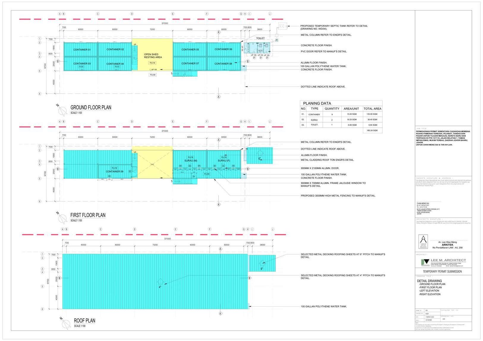 THIS PROJECT BELONGS TO TEMPORARY PERMIT. THIS IS BECAUSE THE OWNER'S ORIGINAL PERMISSION HAS EXPIRED, SO IT NEEDS TO RESUBMIT AGAIN. I AM FULLY RESPONSIBLE FOR THIS PROJECT, FROM MEET OWNER, MEASURE, DRAW CAD DRAWING PRE-CONSULT, AND SUBMISSION. THE SITE IS AN OPEN STRUCTURE FACTORY, LOCATED AT MUKIM TERBAU, JOHOR BAHRU. THIS FACTORY IS MAINLY FOR STORES CONTAINERS.