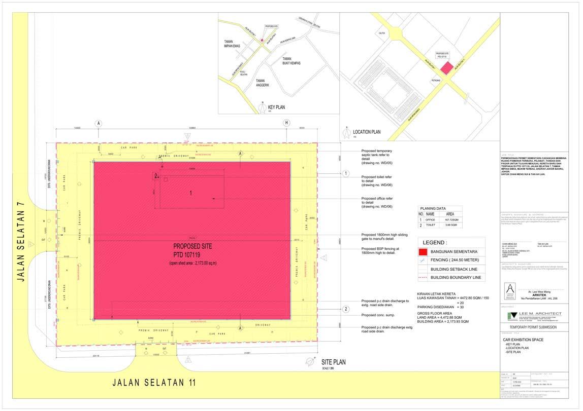 THIS PROJECT BELONGS TO TEMPORARY PERMIT. THIS IS BECAUSE THE OWNER'S ORIGINAL PERMISSION HAS EXPIRED, SO IT NEEDS TO RESUBMIT AGAIN. I AM FULLY RESPONSIBLE FOR THIS PROJECT, FROM MEET OWNER, MEASURE, DRAW CAD DRAWING, PRE-CONSULT, AND SUBMISSION. THE SITE IS AN OPEN STRUCTURE FACTORY, LOCATED AT SKUDAI, JOHOR BAHRU. THIS FACTORY IS MAINLY FOR SELLING SECOND-HAND LORRY AND NEW LORRY.