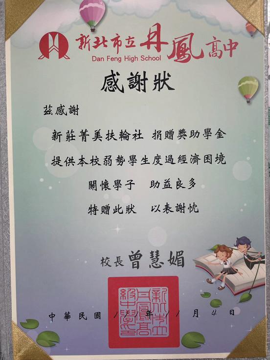 期望新莊菁美扶輪社能夠繼續以沉穩腳步,熱忱精神,持 續茁壯成長。