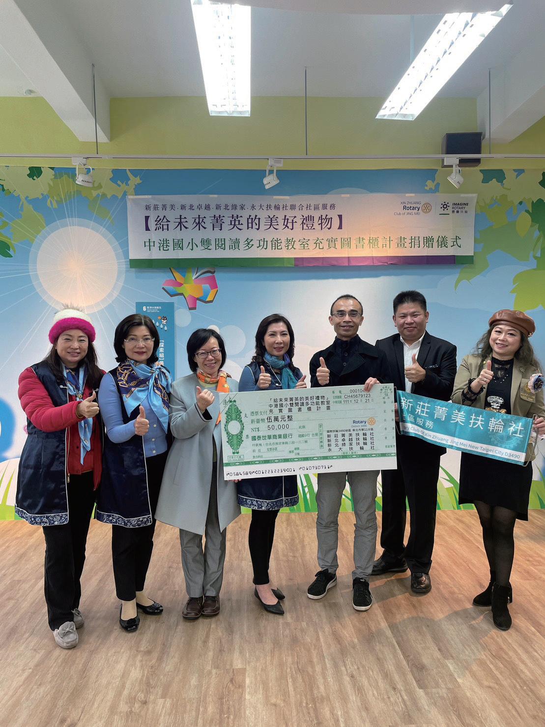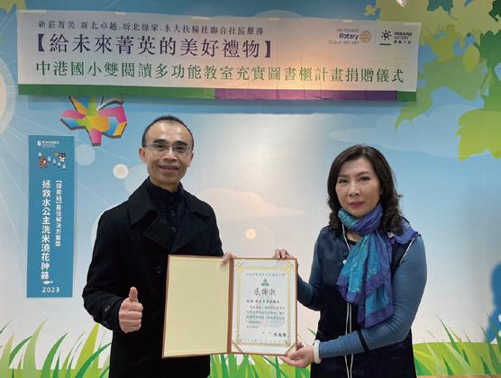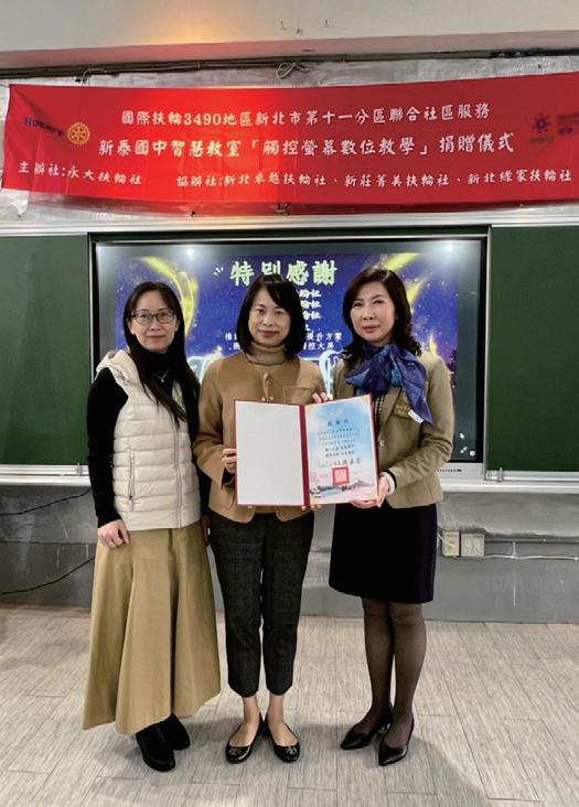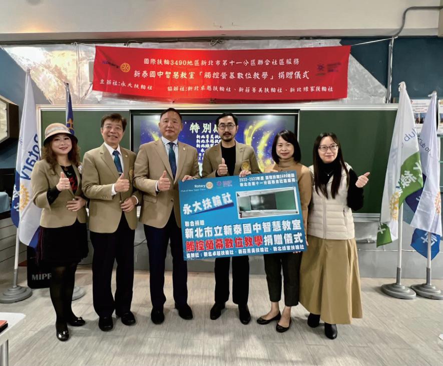 3490地區主辦的WCS宜蘭縣南澳鄉募集計劃以及扶輪書屋活動貴社共捐贈 八萬元,也積極參與分區舉辦的根除小兒麻痺單車環島以、扶輪公益路跑以 及世界和平日活動。並配合新北市第11分區舉辦卓越盃身障桌球、好日子愛 心大平台居家公益修繕、新泰國中智慧教室「觸控螢幕數位教學」捐贈。