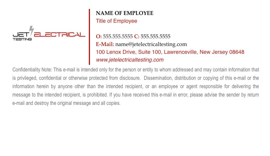 All JET Electrical Testing staff are prohibited from creating their own personal business cards. Please do not alter or stretch or alter the business card on a digital format ex. on a personal cellular device.