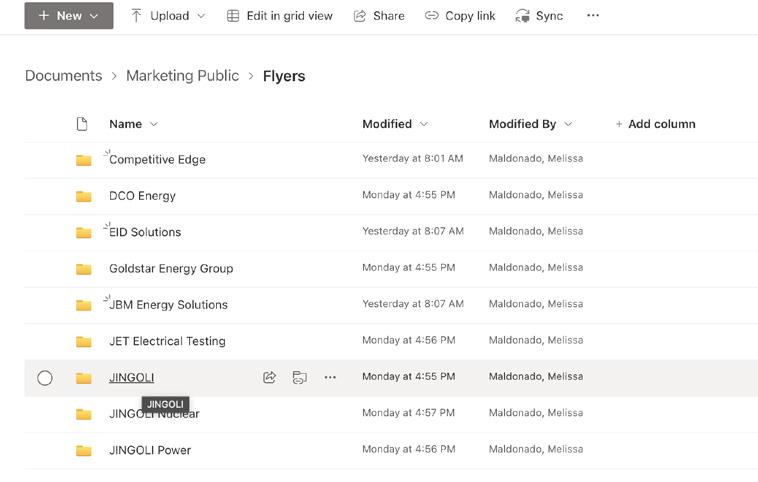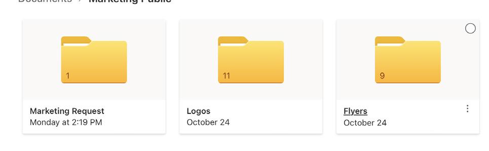 At the top section of the SharePoint, there are three sections: “Marketing Request” for custom requests. (Covered within the next pages of booklet) If you need a logo, you can click the folder in the middle. If you need a specific company flyer, it is the link on the right. All other folders below are other resources you can access.