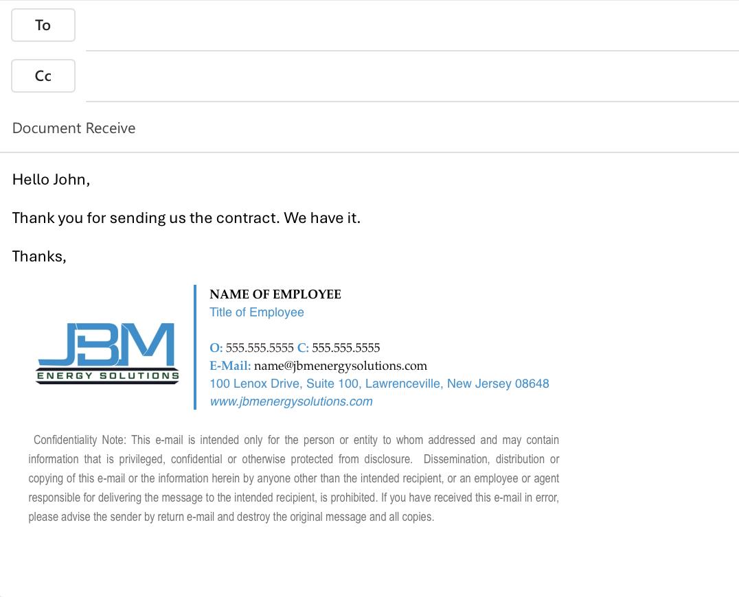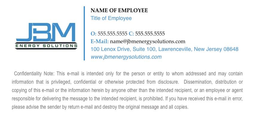 Do not alter the integrity of the signature. All JBM Energy Solutions employees, please only use the all company logos if you liaison with our family of companies.