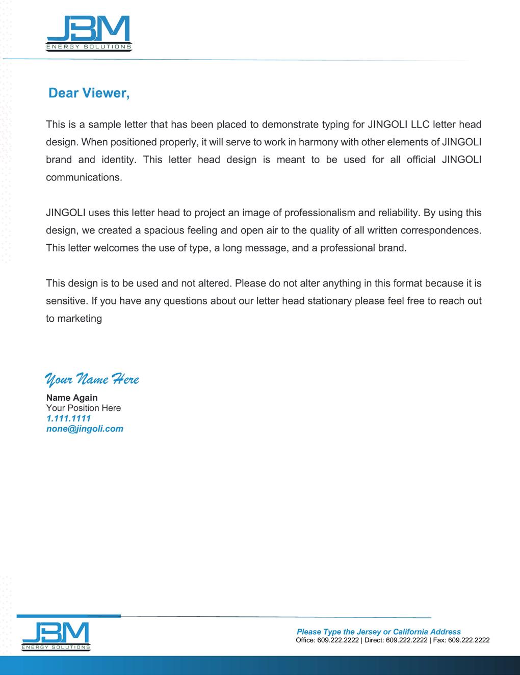 JBM Energy Solutions uses this letterhead to project an image of professionalism and reliability.