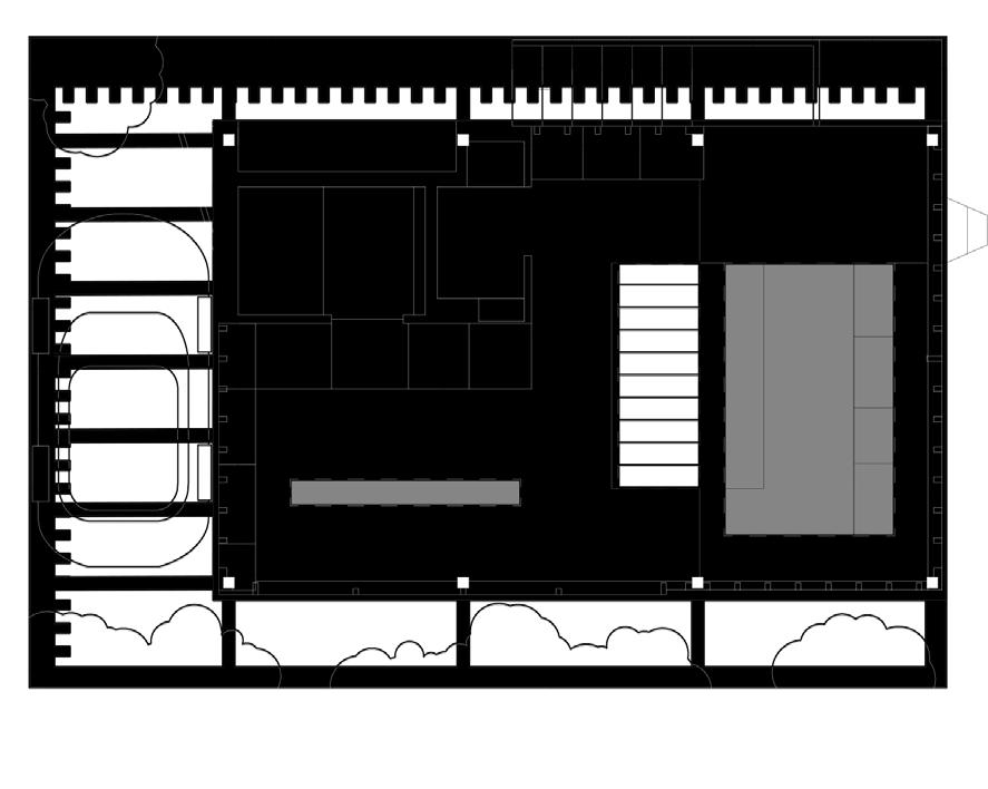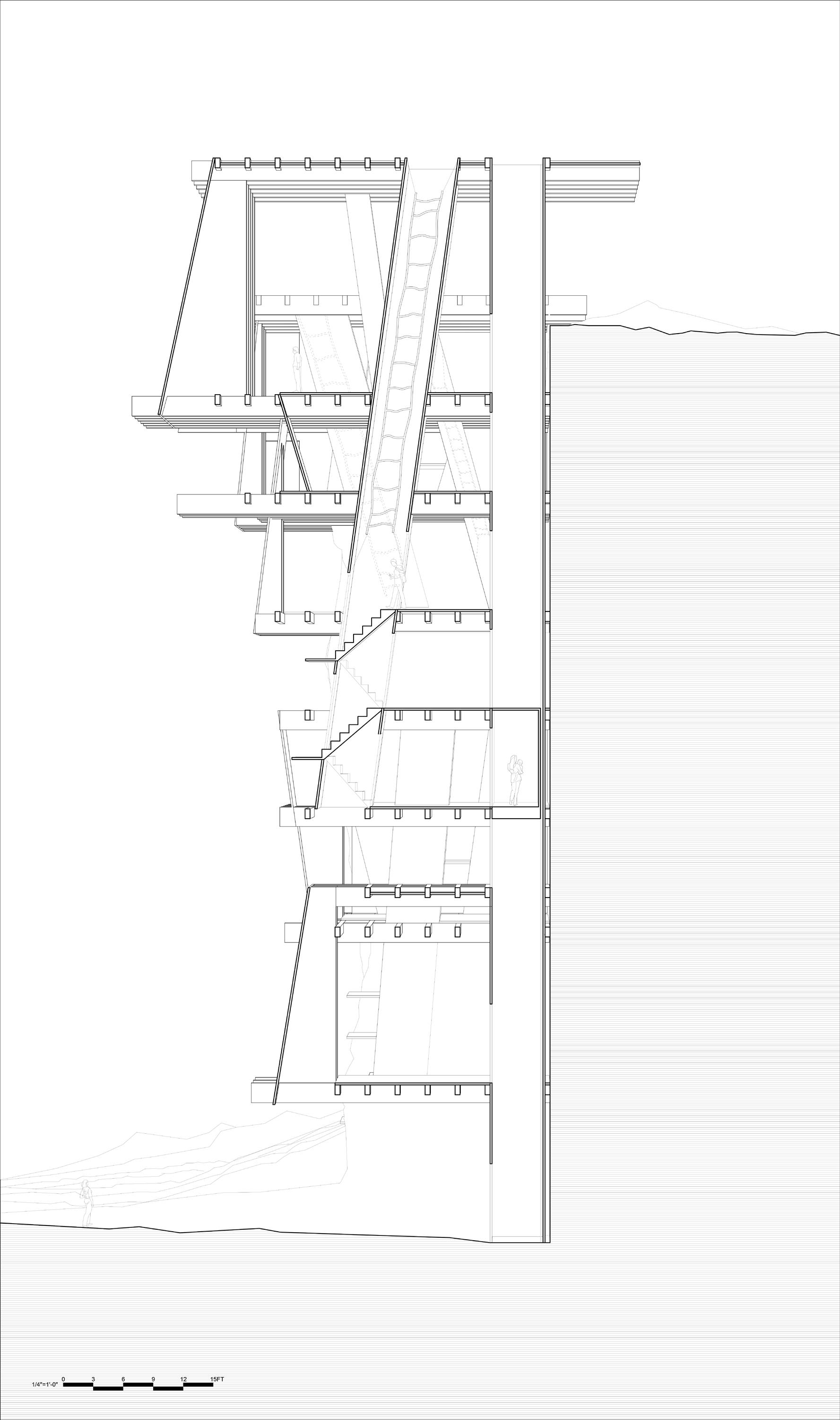 Demonstrates the circulation of the visitor from the top of the cliff to the bottom, passing in and out of the rock surface with alternating lighting conditions. The encounters of the same light shaft at different points of the journey employs the technique of dérive and engenders opportunities for memory and imagination. The figure-ground of explored versus uncharted space visually represents the cumulative knowledge one attains along the way, illustrating an iceburg scenario where the scale and content of the gallery is hidden by the cliff at the start and gradually revealed as one reaches the bottom.