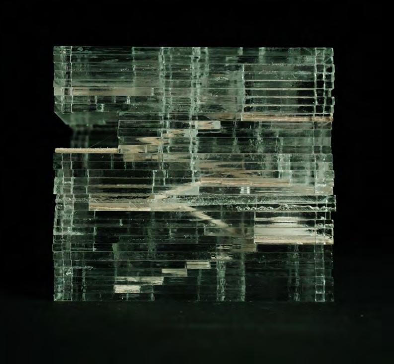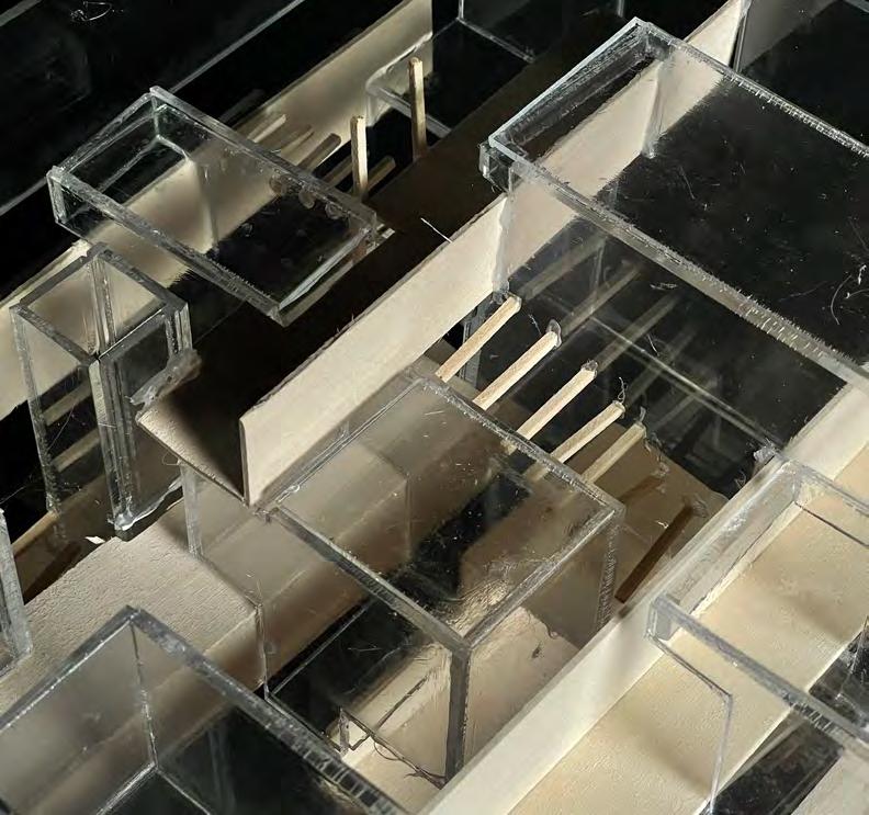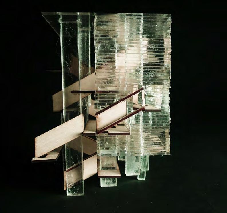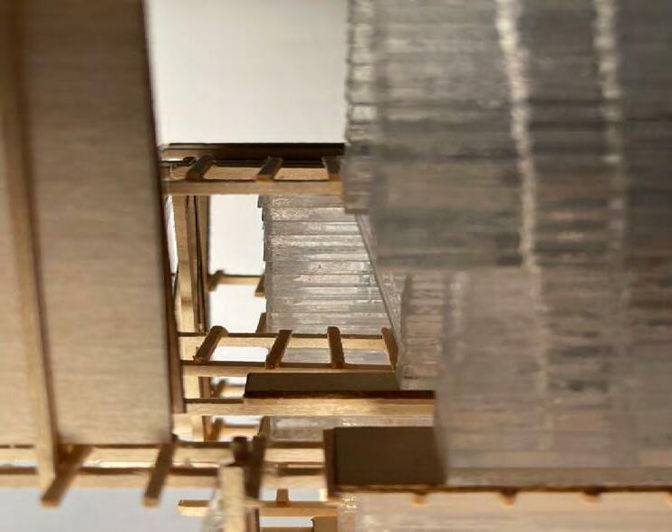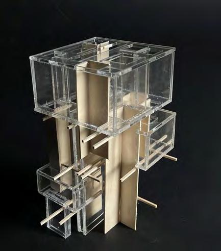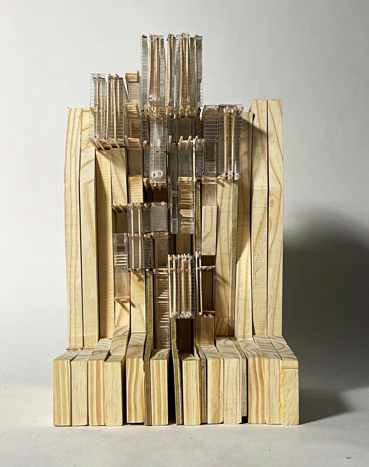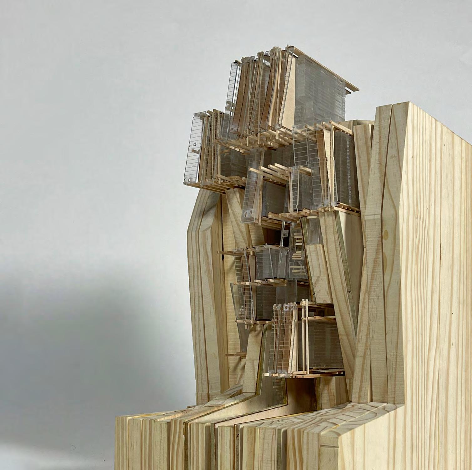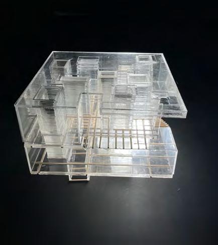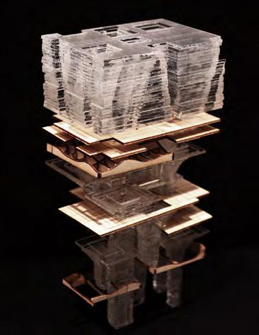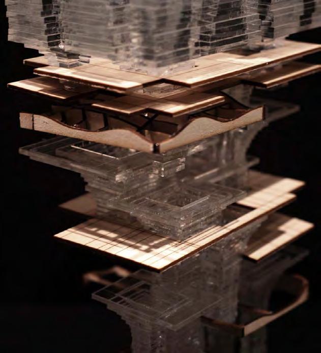 As an extension of the drawings, the model generates positive and negative spaces with the lamination of acrylic sheets that operate the same logic of time penetrating space. The materiality of acrylic captures the ephemeral and temporal qualities of the light and metabolism concepts, while the layered technique articulates the notion of a sedimentation of time. The dialogue between acrylic and wood, the transparent and the opaque, the volumetric and the planar, explores the aforementioned connection of time and space, while the interplay of positive and negative spaces explores the different ways in which vertical elements are introduced in the two precedents.