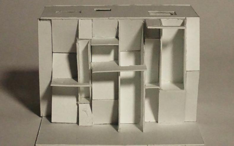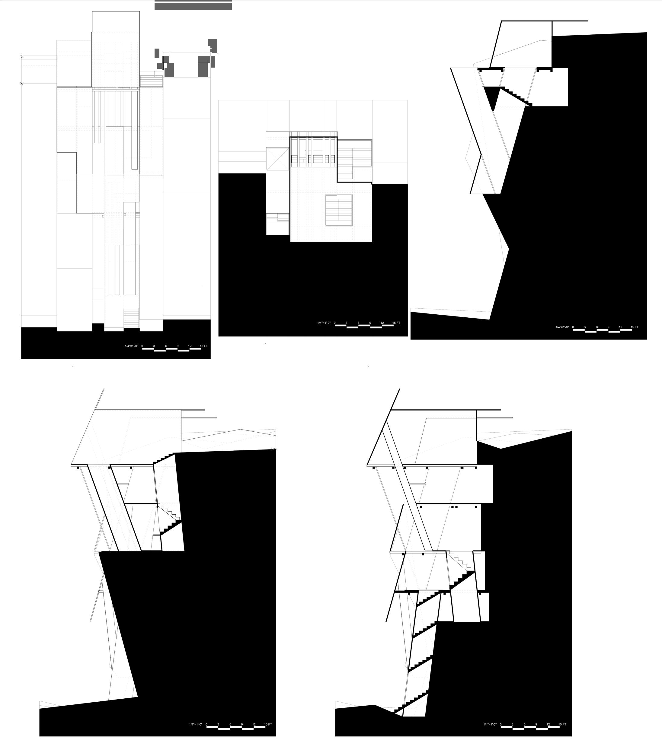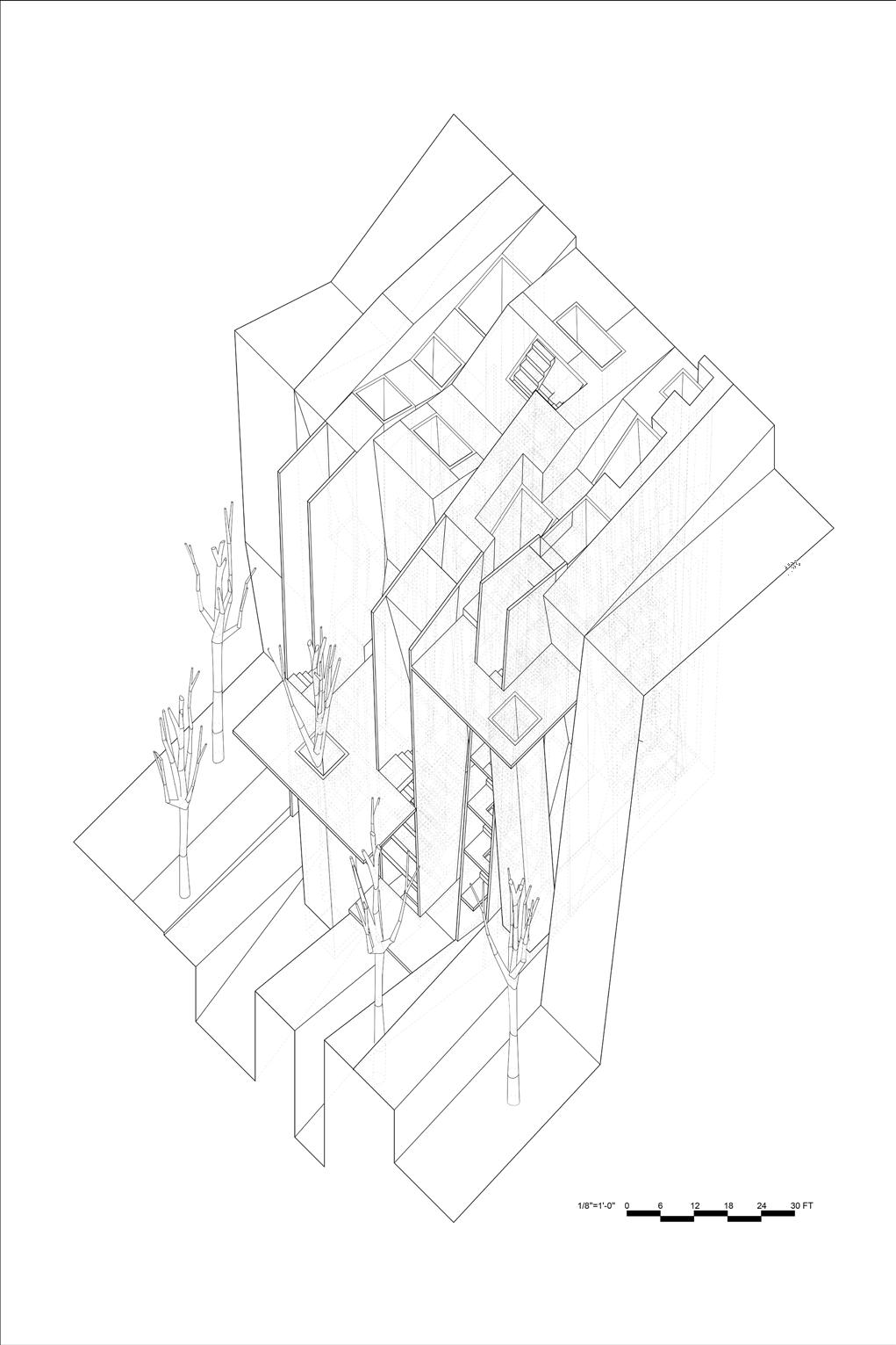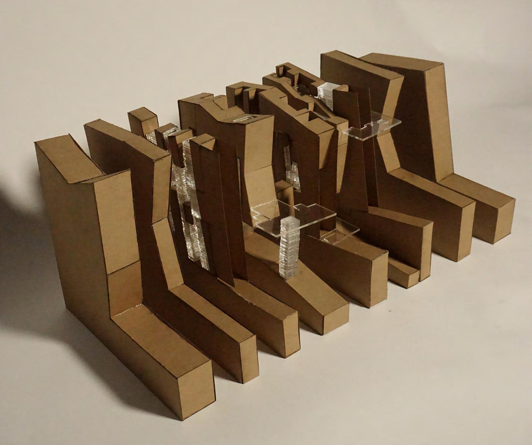 Study Model 8 features opposite figure-ground conditions among the two halves of the model, which indicates that the architecture should be sited in a cliff to make possible the coexistence of positive and negative spaces on both sides of a vertical surface. The slanting of light shafts in the speculative drawing is reconsidered and employed to carve the surface of the cliff into vertical strips, thus creating a dialogue between the landscape and the architectural intervention. The light shafts are alternatively conceived as both vertical circulation cores and elongated exhibition cases connected by horizontal platforms at different points to engender promenade circulation, such that the stairs are alll contained by the shafts. One would enter from the top of the cliff and exit from the bottom. Programs are thus blended with circulation and arranged in vertical layers similar to the precedents, aligning the spatial configuration of the architecture with the experience of the visitors.