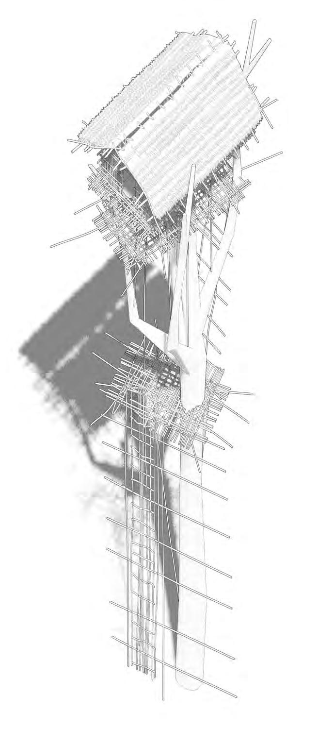 The project begins by analyzing the West Papuan Treehouse and Gae House with technical and demonstrative drawings, exploring the shared architectural logic and language among the two precedents in terms of structure, program, context, and lighting conditions. The precedents are found to feature vertical structures / voids which connect isolated spaces with light, sight, and circulation. This logic is then translated into a speculative drawing and model to further investigate potential spatial oppurtnities from which subsequent designs would depart.