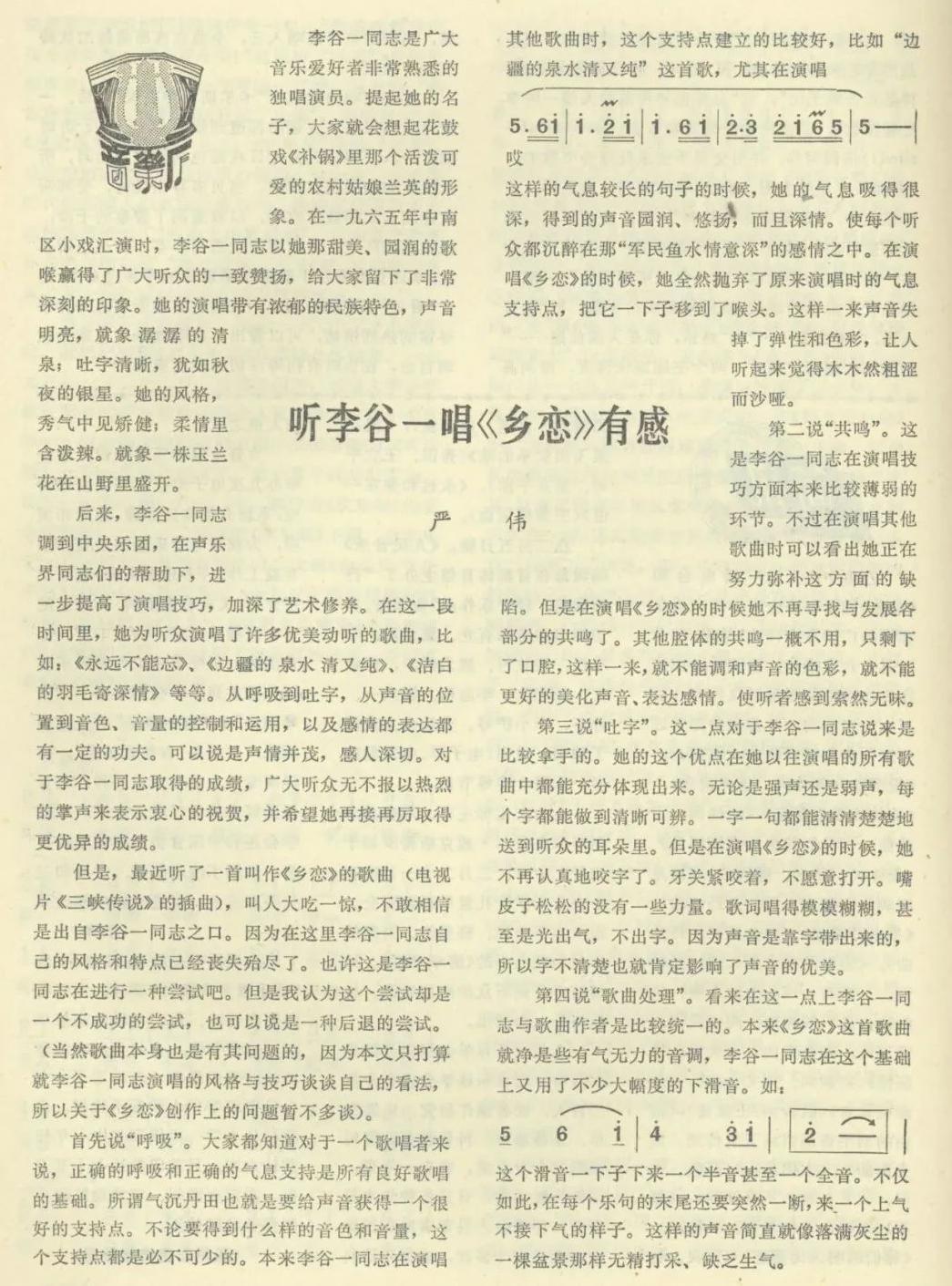 〈乡恋〉》。报道肯定了李谷一在音乐 领域的探索,认为这与整个时代改革的 方向是吻合的。她的唱法表明了“一个