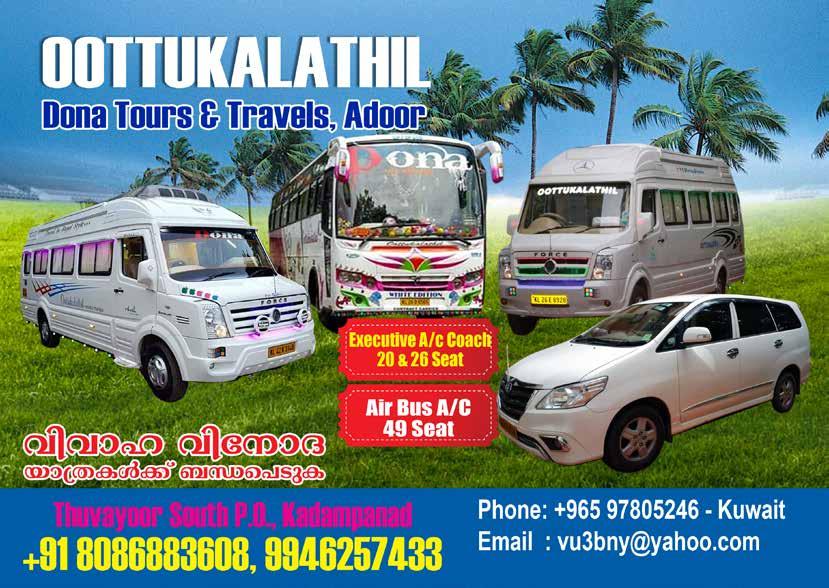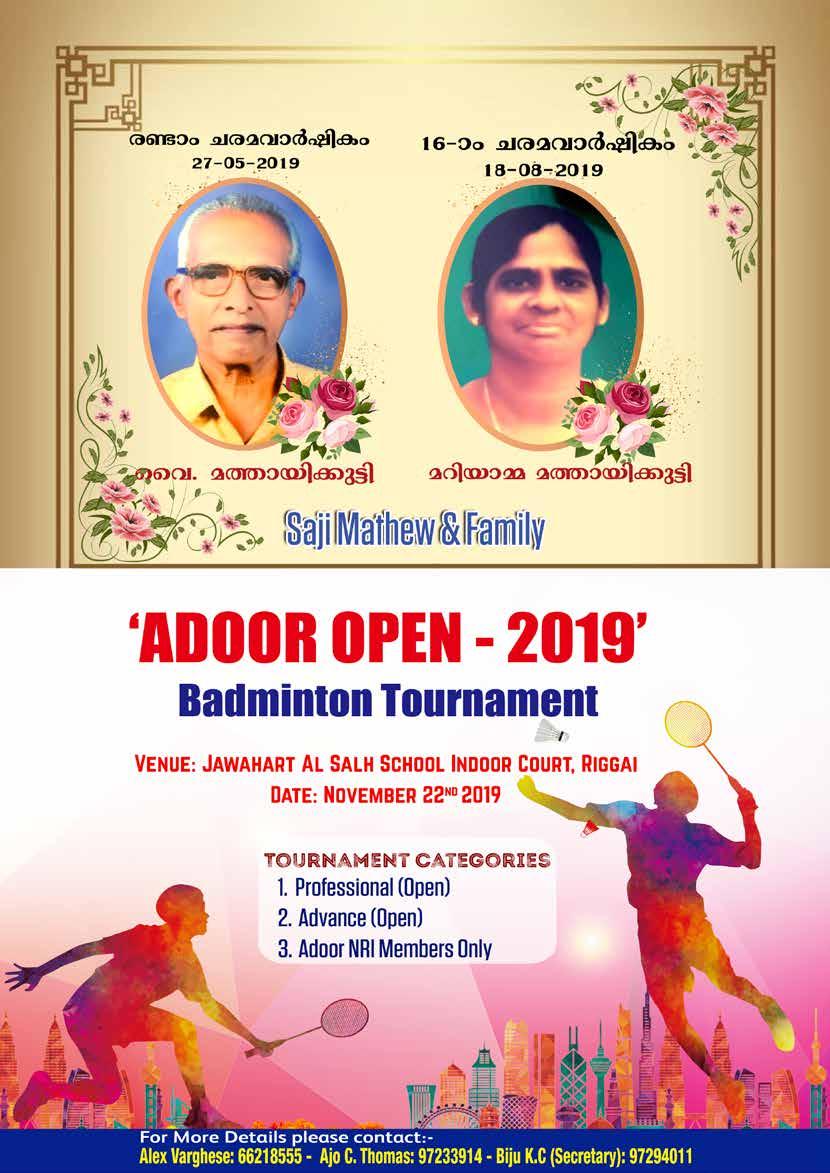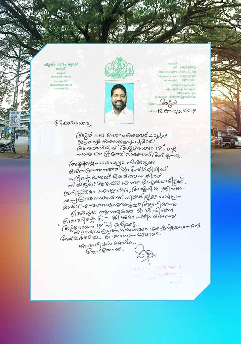 We, the General conveners have the pleasure to avail this opportunity to thank the hon. President, hon. General Secretary and all the ofïŹce bearers and the Advisory, executive and ladies wing for their whole hearted support. We thank Adooronam 2019 committee also for their tireless effort to make this event a grand success. We extend our sincere gratitude to our sponsors and well-wishers too for their invaluable support. Last, but not least, we thank Kuwait and its visionary leaders and friendly people for their great opportunity, so as this platform.