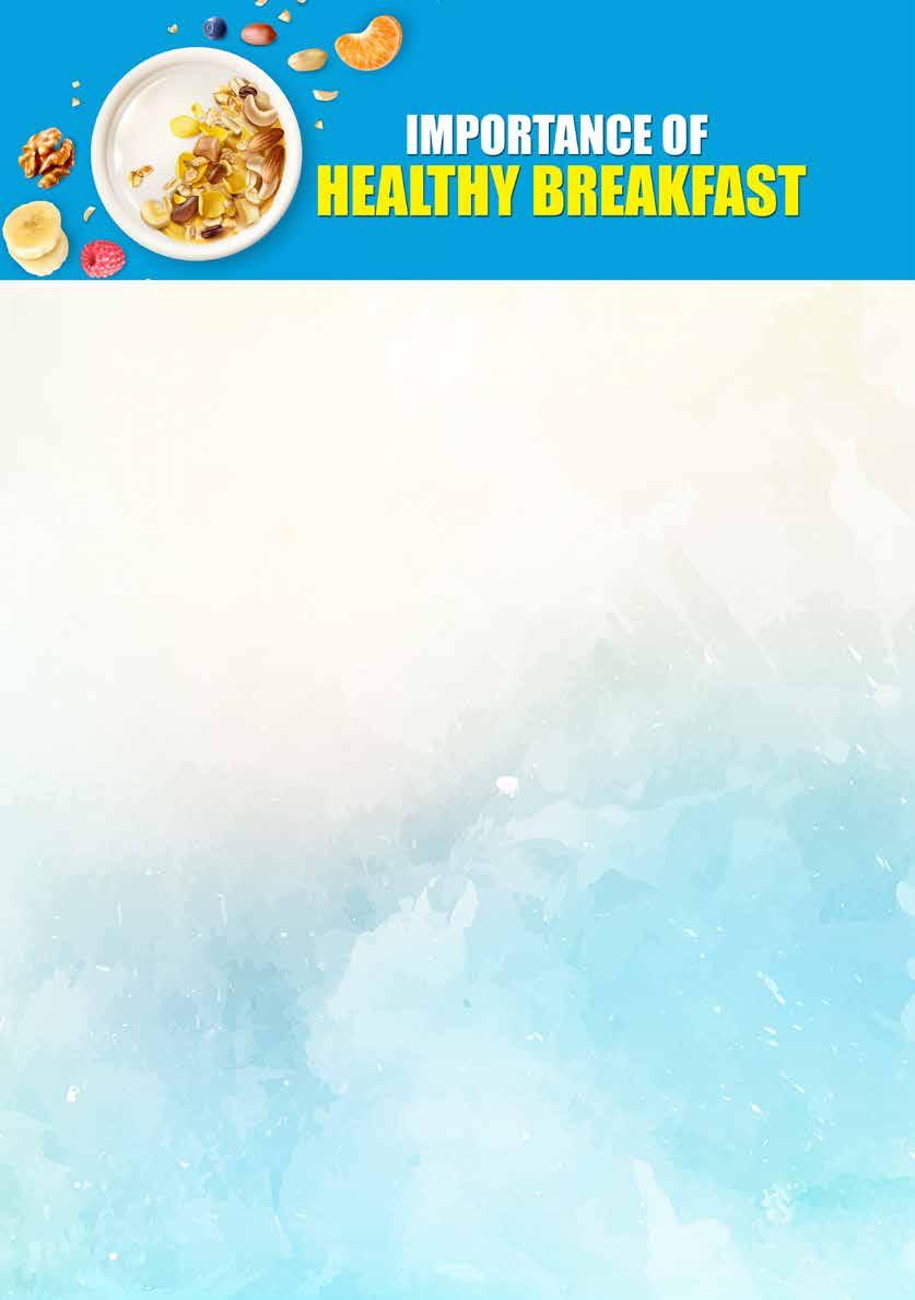 Nutritionist Masters in Nutrition âą Idli + sambar + fruits+ dairy (milk/ïŹavored yoghurt) âą Whole wheat puttu + channa + fruit +dairy âą Egg(boiled /omelets/scrambled)+whole wheat bread+ fruit +dairy âą Chapatti +veg curry+fruit+dairy+nuts âą Broken wheat upma + banana+ dairy + nuts âą Bran ïŹakes / cornïŹakes + fruits+nuts+dairy âąWhole wheat pancake+ peanut butter+fruits+dairy âą Oats porridge with fruits and mixed nuts Make sure that no one in your house skips breakfast. A healthy breakfast is essential for a healthy life.
